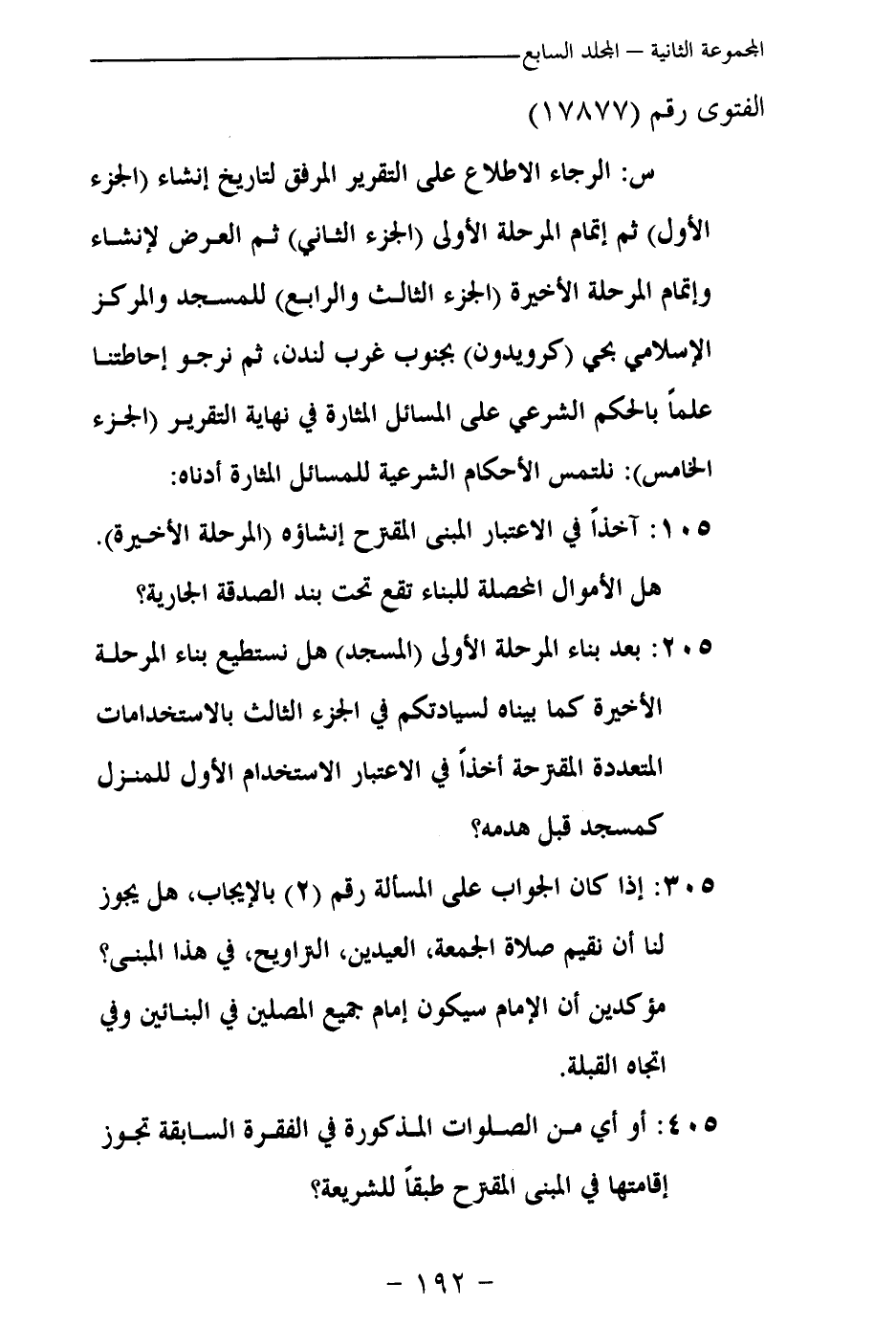 س: الرجاء الاطلاع على التقرير المرفق لتاريخ إنشاء (الجزء الأول) ثم إتمام المرحلة الأولى (الجزء الثاني) ثم العرض لإنشاء وإتمام المرحلة الأخيرة (الجزء الثالث والرابع) للمسجد والمركز الإسلامي بحي (كرويدون) بجنوب غرب لندن، ثم نرجو إحاطتنا علما بالحكم الشرعي على المسائل المثارة في نهاية التقرير (الجزء الخامس) : نلتمس الأحكام الشرعية للمسائل المثارة أدناه: