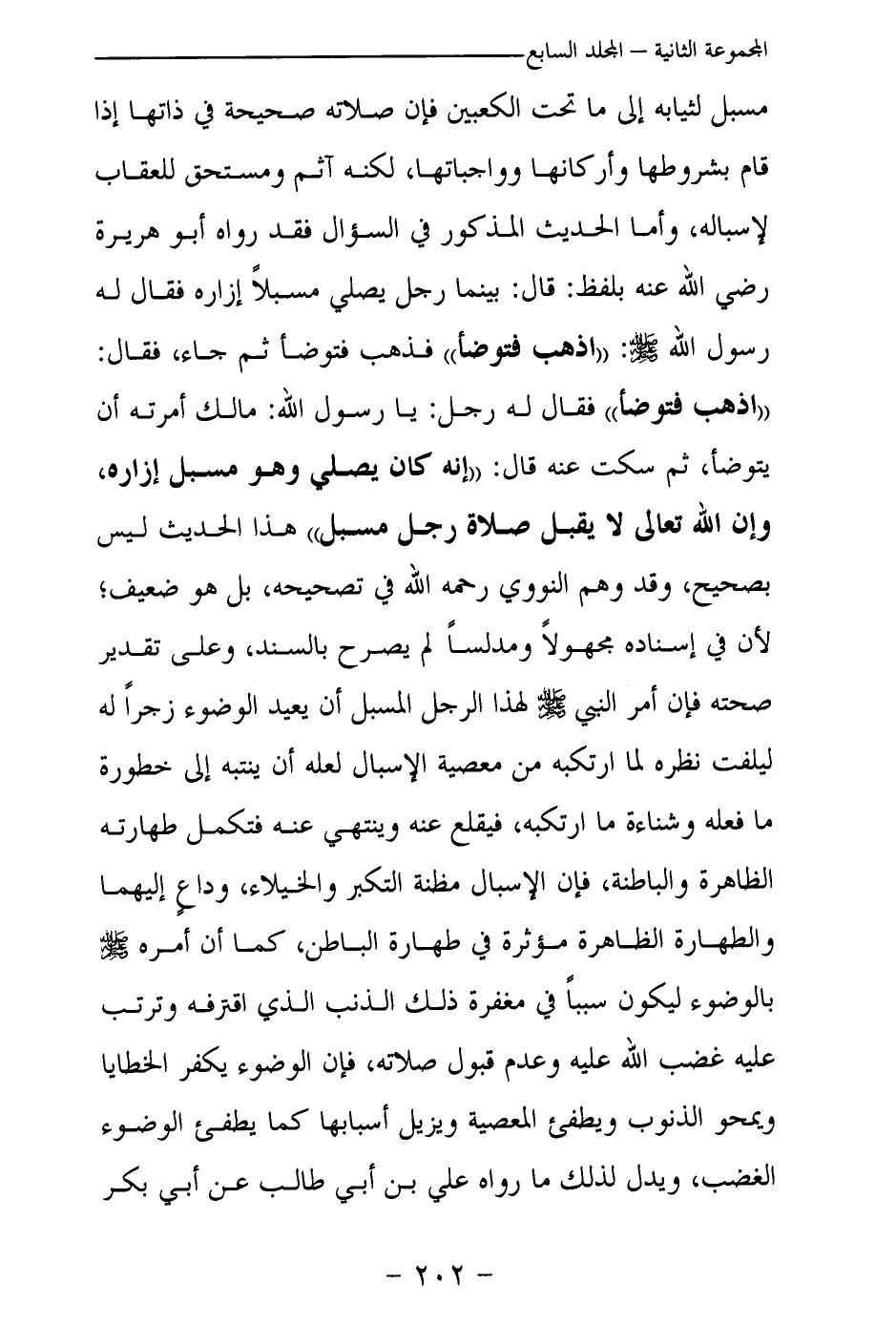 مسبل لثيابه إلى ما تحت الكعبين فإن صلاته صحيحة في ذاتها إذا قام بشروطها وأركانها وواجباتها، لكنه آثم ومستحق للعقاب لإسباله، وأما الحديث المذكور في السؤال فقد رواه أبو هريرة رضي الله عنه بلفظ: قال: «بينما رجل يصلي مسبلا إزاره فقال له رسول الله - صلى الله عليه وسلم -: اذهب فتوضأ فذهب فتوضأ ثم جاء، فقال: اذهب فتوضأ فقال له رجل: يا رسول الله: مالك أمرته أن يتوضأ، ثم سكت عنه قال: إنه كان يصلي وهو مسبل إزاره، وإن الله تعالى لا يقبل صلاة رجل مسبل (¬1) » هذا الحديث ليس بصحيح، وقد وهم النووي رحمه الله في تصحيحه، بل هو ضعيف؛ لأن في إسناده مجهولا ومدلسا لم يصرح بالسند، وعلى تقدير صحته فإن أمر النبي - صلى الله عليه وسلم - لهذا الرجل المسبل أن يعيد الوضوء زجرا له ليلفت نظره لما ارتكبه من معصية الإسبال لعله أن ينتبه إلى خطورة ما فعله وشناءة ما ارتكبه، فيقلع عنه وينتهي عنه فتكمل طهارته الظاهرة والباطنة، فإن الإسبال مظنة التكبر والخيلاء، وداع إليهما والطهارة الظاهرة مؤثرة في طهارة الباطن، كما أن أمره - صلى الله عليه وسلم - بالوضوء ليكون سببا في مغفرة ذلك الذنب الذي اقترفه وترتب عليه غضب الله عليه وعدم قبول صلاته، فإن الوضوء يكفر الخطايا ويمحو الذنوب ويطفئ المعصية ويزيل أسبابها كما يطفئ الوضوء الغضب، ويدل لذلك ما رواه علي بن أبي طالب عن أبي بكر