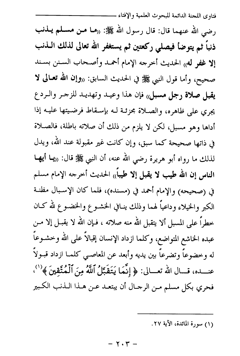 رضي الله عنهما قال: قال رسول الله - صلى الله عليه وسلم -: «ما من مسلم يذنب ذنبا ثم يتوضأ فيصلي ركعتين ثم يستغفر الله تعالى لذلك الذنب إلا غفر له (¬1) » الحديث أخرجه الإمام أحمد وأصحاب السنن بسند صحيح، وأما قول النبي - صلى الله عليه وسلم - في الحديث السابق «وإن الله تعالى لا يقبل صلاة رجل مسبل (¬2) » فإن هذا وعيد وتهديد للزجر والردع يجري على ظاهره، والصلاة مجزئة له بإسقاط فرضيتها عليه إذا أداها وهو مسبل، ولكن لا يلزم من ذلك أن صلاته باطلة، فالصلاة في ذاتها صحيحة كما سبق، وإن كانت غير مقبولة عند الله، ويدل لذلك ما رواه أبو هريرة رضي الله عنه، أن النبي - صلى الله عليه وسلم - قال: «يا أيها الناس إن الله طيب لا يقبل إلا طيبا (¬3) » الحديث أخرجه الإمام مسلم في (صحيحه) والإمام أحمد في (مسنده) ، فلما كان الإسبال مظنة الكبر والخيلاء وداعيا لهما وذلك ينافي الخشوع والخضوع لله كان خطرا على المسبل ألا يتقبل الله منه صلاته، فإن الله لا يقبل إلا من عبده الخاشع المتواضع، وكلما ازداد الإنسان إقبالا على الله وخشوعا له وخضوعا وتضرعا بين يديه وأبعد عن المعاصي كلما ازداد قبولا عنده، قال الله تعالى: {إِنَّمَا يَتَقَبَّلُ اللَّهُ مِنَ الْمُتَّقِينَ} (¬4) ، فحري بكل مسلم من الرجال أن يبتعد عن هذا الذنب الكبير