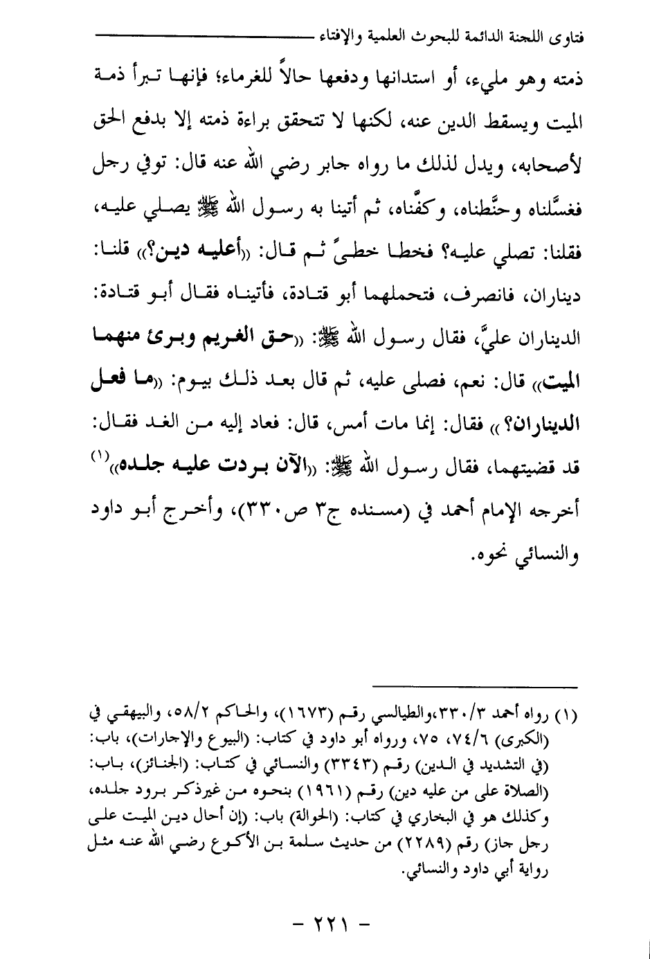 (¬1) رواه أحمد 3\330، والطيالسي رقم (1673) ، والحاكم 2\58، والبيهقي في (الكبرى) 6\74، 75، ورواه أبو داود في كتاب: (البيوع والإجارات) ، باب: (في التشديد في الدين) رقم (3343) ، والنسائي في كتاب: (الجنائز) ، باب: (الصلاة على من عليه دين) رقم (1961) بنحوه من غير ذكر برود جلده، وكذلك هو في البخاري في كتاب: (الحوالة) ، باب: (إن أحال دين الميت على رجل جاز) رقم (2289) من حديث سلمة بن الأكوع رضي الله عنه مثل رواية أبي داود والنسائي.