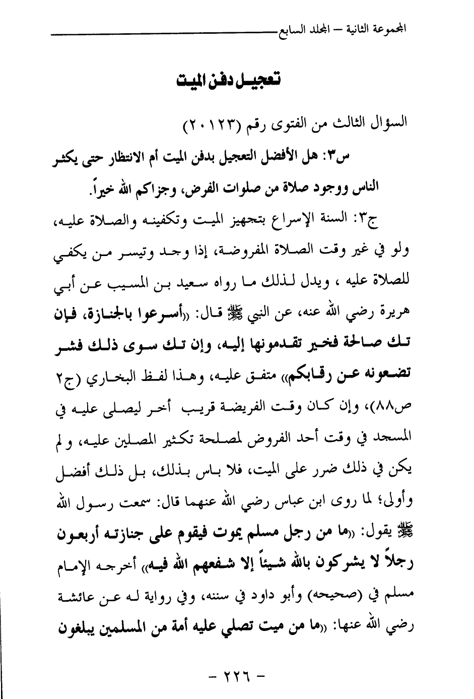 ج 3: السنة الإسراع بتجهيز الميت وتكفينه والصلاة عليه، ولو في غير وقت الصلاة المفروضة، إذا وجد وتيسر من يكفي للصلاة عليه، ويدل لذلك ما رواه سعيد بن المسيب عن أبي هريرة رضي الله عنه، عن النبي - صلى الله عليه وسلم - قال: «أسرعوا بالجنازة، فإن تك صالحة فخير تقدمونها إليه، وإن تك سوى ذلك فشر تضعونه عن رقابكم (¬1) » متفق عليه، وهذا لفظ البخاري (ج 2 ص 88) ، وإن كان وقت الفريضة قريبا أخر ليصلى عليه في المسجد في وقت أحد الفروض لمصلحة تكثير المصلين عليه، ولم يكن في ذلك ضرر على الميت، فلا بأس بذلك، بل ذلك أفضل وأولى؛ لما روى ابن عباس رضي الله عنهما قال: سمعت رسول الله - صلى الله عليه وسلم - يقول: «ما من رجل مسلم يموت فيقوم على جنازته أربعون رجلا لا يشركون بالله شيئا إلا شفعهم الله فيه (¬2) » أخرجه الإمام مسلم في (صحيحه) وأبو داود في سننه، وفي رواية له عن عائشة رضي الله عنها: «ما من ميت تصلي عليه أمة من المسلمين يبلغون