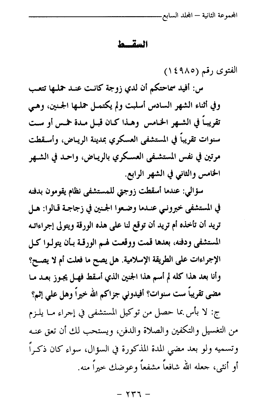 س: أفيد سماحتكم أن لدي زوجة كانت عند حملها تتعب وفي أثناء الشهر السادس أسلبت ولم يكتمل حملها الجنين، وهي تقريبا في الشهر الخامس وهذا كان قبل مدة خمس أو ست سنوات تقريبا في المستشفى العسكري بمدينة الرياض، وأسقطت مرتين في نفس المستشفى العسكري بالرياض، واحد في الشهر الخامس والثاني في الشهر الرابع.