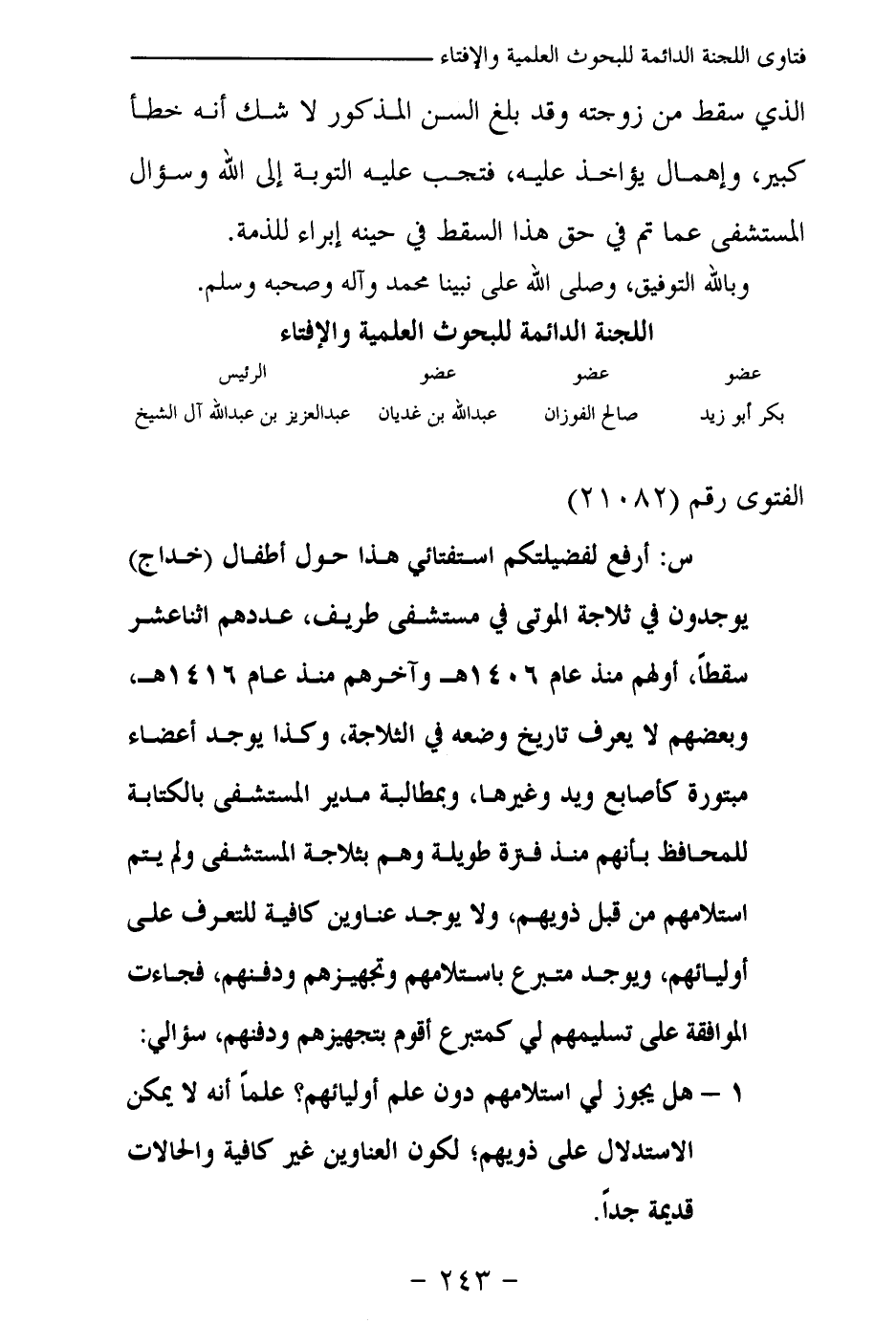 س: أرفع لفضيلتكم استفتائي هذا حول أطفال (خداج) يوجدون في ثلاجة الموتى في مستشفى طريف، عددهم اثنا عشر سقطا، أولهم منذ عام 1406 هـ وآخرهم منذ عام 1416 هـ، وبعضهم لا يعرف تاريخ وضعه في الثلاجة، وكذا يوجد أعضاء مبتورة كأصابع ويد وغيرها، وبمطالبة مدير المستشفى بالكتابة للمحافظ بأنهم منذ فترة طويلة وهم بثلاجة المستشفى ولم يتم استلامهم من قبل ذويهم، ولا يوجد عناوين كافية للتعرف على أوليائهم، ويوجد متبرع باستلامهم وتجهيزهم ودفنهم، فجاءت الموافقة على تسليمهم لي كمتبرع أقوم بتجهيزهم ودفنهم، سؤالي: