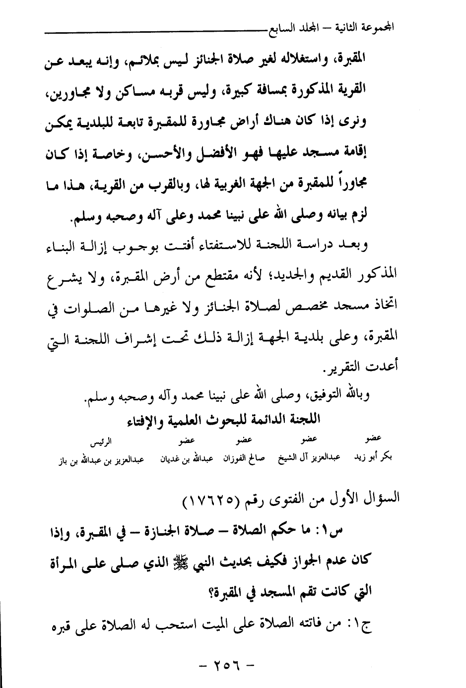 وبعد دراسة اللجنة للاستفتاء أفتت بوجوب إزالة البناء المذكور القديم والجديد؛ لأنه مقتطع من أرض المقبرة، ولا يشرع اتخاذ مسجد مخصص لصلاة الجنائز ولا غيرها من الصلوات في المقبرة، وعلى بلدية الجهة إزالة ذلك تحت إشراف اللجنة التي أعدت التقرير.