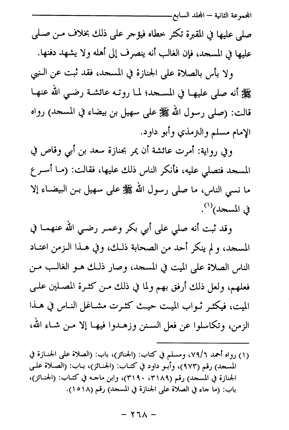 (¬2) رواه أحمد 6\79، ومسلم في كتاب (الجنائز) ، باب (الصلاة على الجنازة في المسجد) رقم (973) ، وأبو داود في كتاب: (الجنائز) ، باب (الصلاة على الجنازة في المسجد) رقم (3189، 3190) ، وابن ماجه في كتاب: (الجنائز) ، باب: (ما جاء في الصلاة على الجنازة في المسجد) رقم (1518) .
