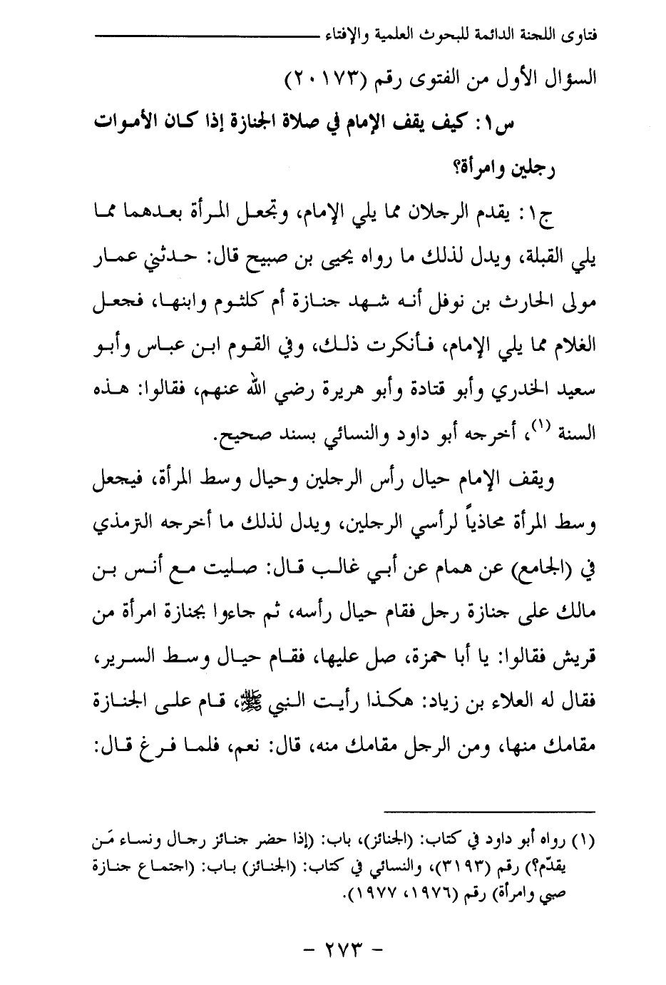 س 1: كيف يقف الإمام في صلاة الجنازة إذا كان الأموات رجلين وامرأة؟