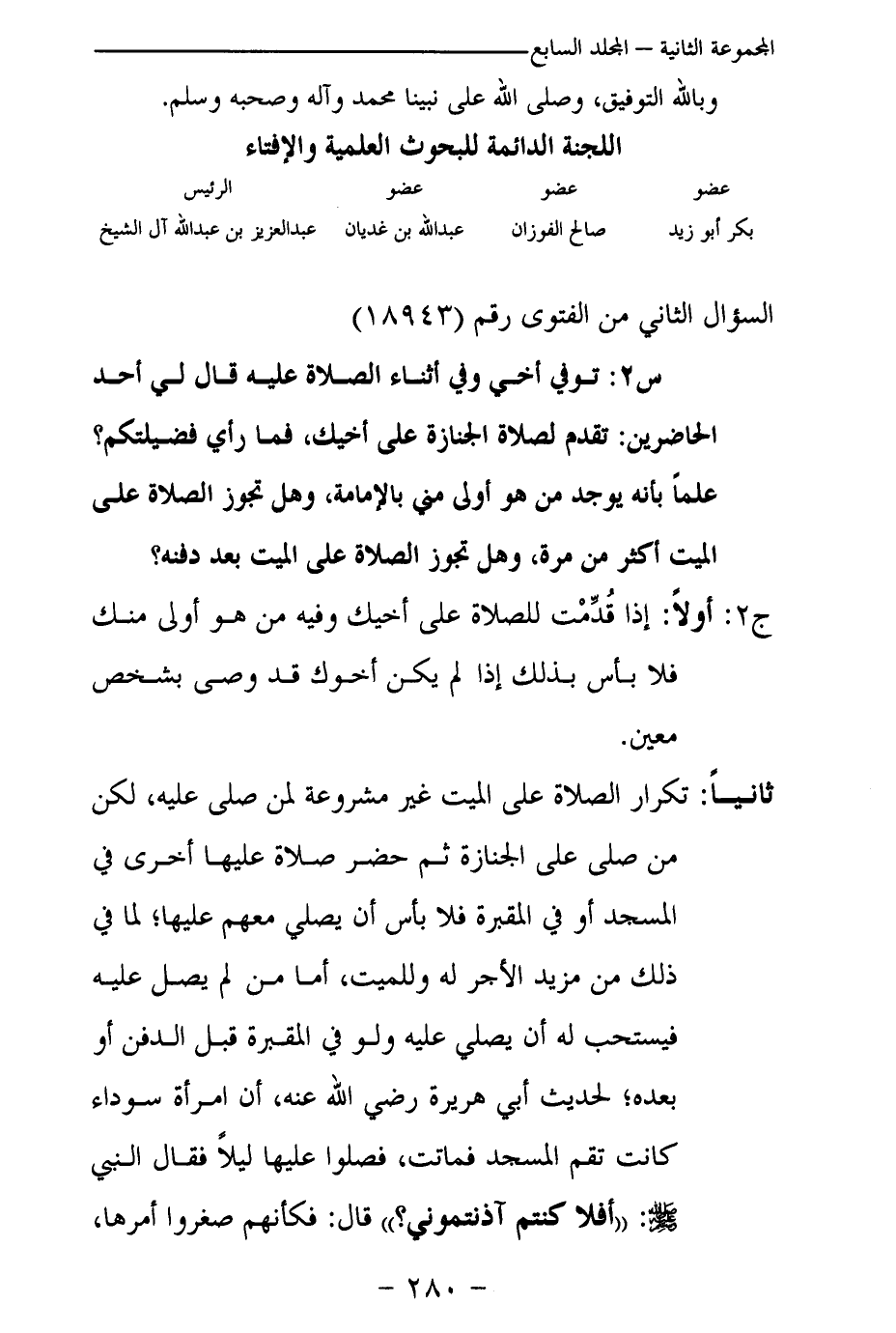 س 2: توفي أخي وفي أثناء الصلاة عليه قال لي أحد الحاضرين: تقدم لصلاة الجنازة على أخيك، فما رأي فضيلتكم؟ علما بأنه يوجد من هو أولى مني بالإمامة، وهل تجوز الصلاة على الميت أكثر من مرة، وهل تجوز الصلاة على الميت بعد دفنه؟