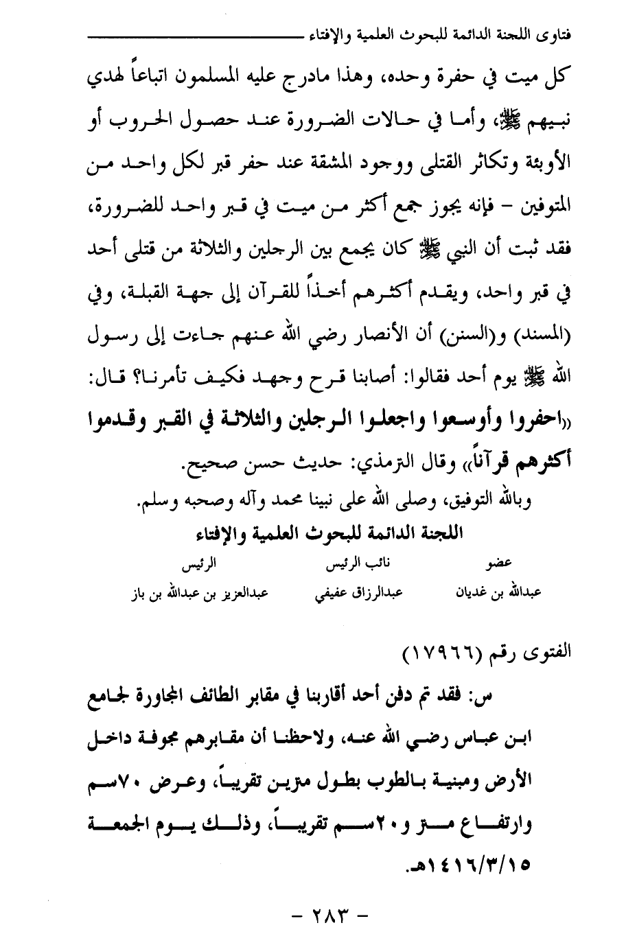 س: فقد تم دفن أحد أقاربنا في مقابر الطائف المجاورة لجامع ابن عباس رضي الله عنه، ولاحظنا أن مقابرهم مجوفة داخل الأرض ومبنية بالطوب بطول مترين تقريبا، وعرض 70 سم وارتفاع متر و20 سم تقريبا، وذلك يوم الجمعة 15 / 3 / 1416 هـ
