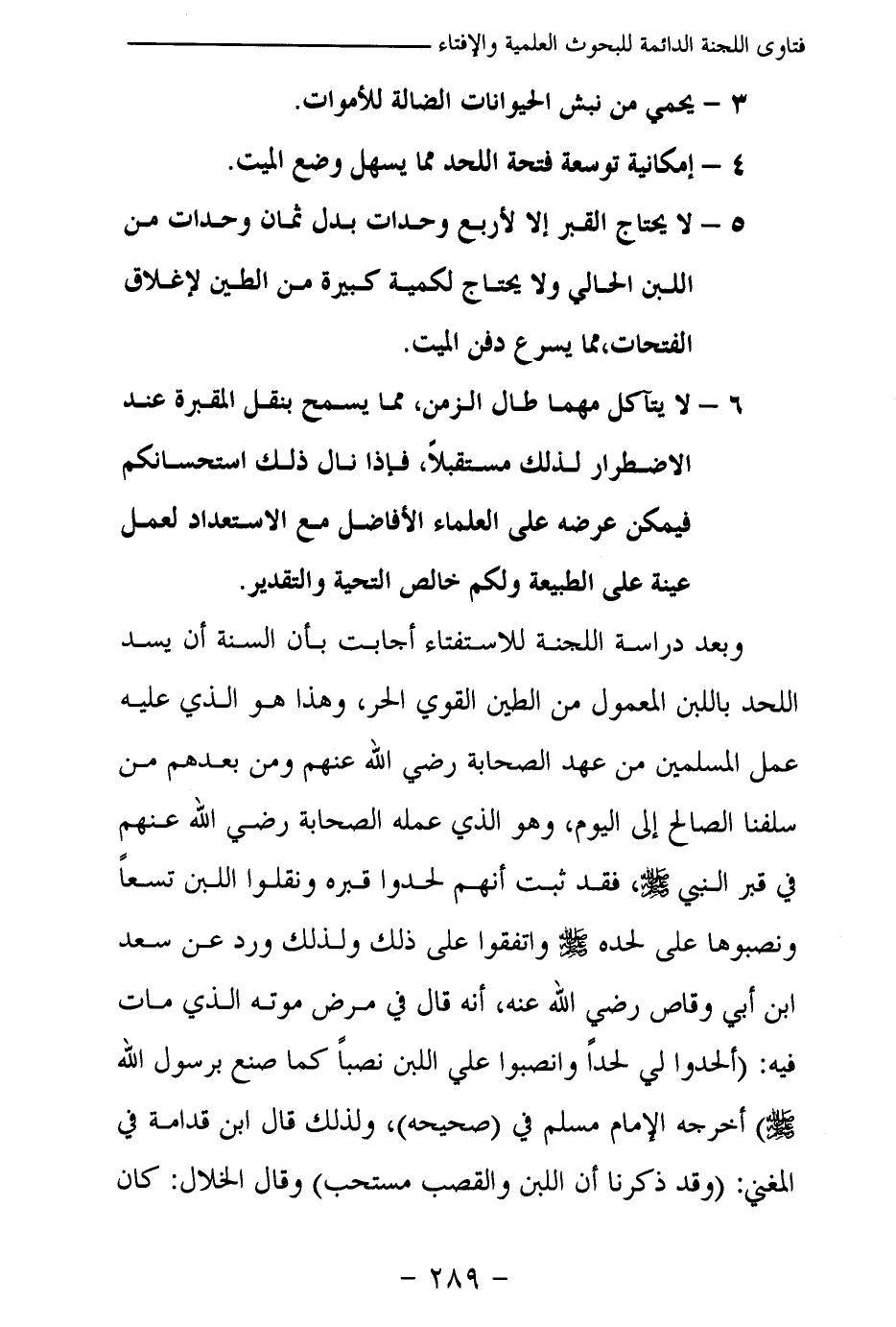 وبعد دراسة اللجنة للاستفتاء أجابت بأن السنة أن يسد اللحد باللبن المعمول من الطين القوي الحر، وهذا هو الذي عليه عمل المسلمين من عهد الصحابة رضي الله عنهم ومن بعدهم من سلفنا الصالح إلى اليوم، وهو الذي عمله الصحابة رضي الله عنهم في قبر النبي - صلى الله عليه وسلم -، فقد ثبت أنهم لحدوا قبره ونقلوا اللبن تسعا ونصبوها على لحده - صلى الله عليه وسلم – واتفقوا على ذلك ولذلك ورد عن سعد بن أبي وقاص رضي الله عنه، أنه قال في مرض موته الذي مات فيه «ألحدوا لي لحدا وانصبوا علي اللبن نصبا كما صنع برسول الله - صلى الله عليه وسلم - (¬1) » أخرجه الإمام مسلم في (صحيحه) ، ولذلك قال ابن قدامة في المغني: (وقد ذكرنا أن اللبن والقصب مستحب) وقال الخلال: كان