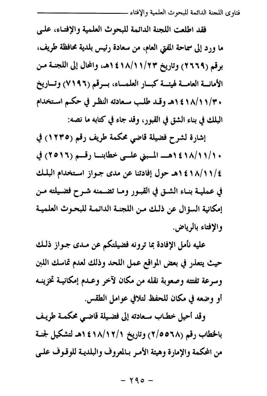 إشارة لشرح فضيلة قاضي محكمة طريف رقم (1235) في 10 / 11 / 1418 هـ المبني على خطابنا رقم (2516) في 4 / 11 / 1418 هـ حول إفادتنا عن مدى جواز استخدام البلك في عملية بناء الشق في القبور وما تضمنه شرح فضيلته من إمكانية السؤال عن ذلك من اللجنة الدائمة للبحوث العلمية والإفتاء بالرياض.