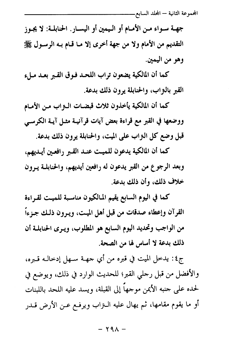 كما أن المالكية يدعون للميت عند القبر رافعين أيديهم، وبعد الرجوع من القبر يدعون له رافعين أيديهم، والحنابلة يرون خلاف ذلك، وأن ذلك بدعة.