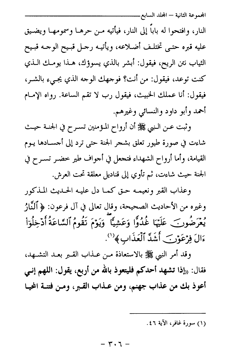 وعذاب القبر ونعيمه حق كما دل عليه الحديث المذكور وغيره من الأحاديث الصحيحة، وقال تعالى في آل فرعون: {النَّارُ يُعْرَضُونَ عَلَيْهَا غُدُوًّا وَعَشِيًّا وَيَوْمَ تَقُومُ السَّاعَةُ أَدْخِلُوا آلَ فِرْعَوْنَ أَشَدَّ الْعَذَابِ} (¬2) .