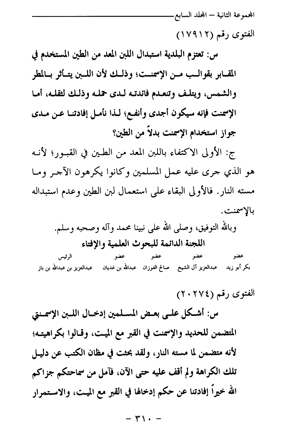 ج: الأولى الاكتفاء باللبن المعد من الطين في القبور؛ لأنه هو الذي جرى عليه عمل المسلمين وكانوا يكرهون الآجر وما مسته النار. فالأولى البقاء على استعمال لبن الطين وعدم استبداله بالإسمنت.