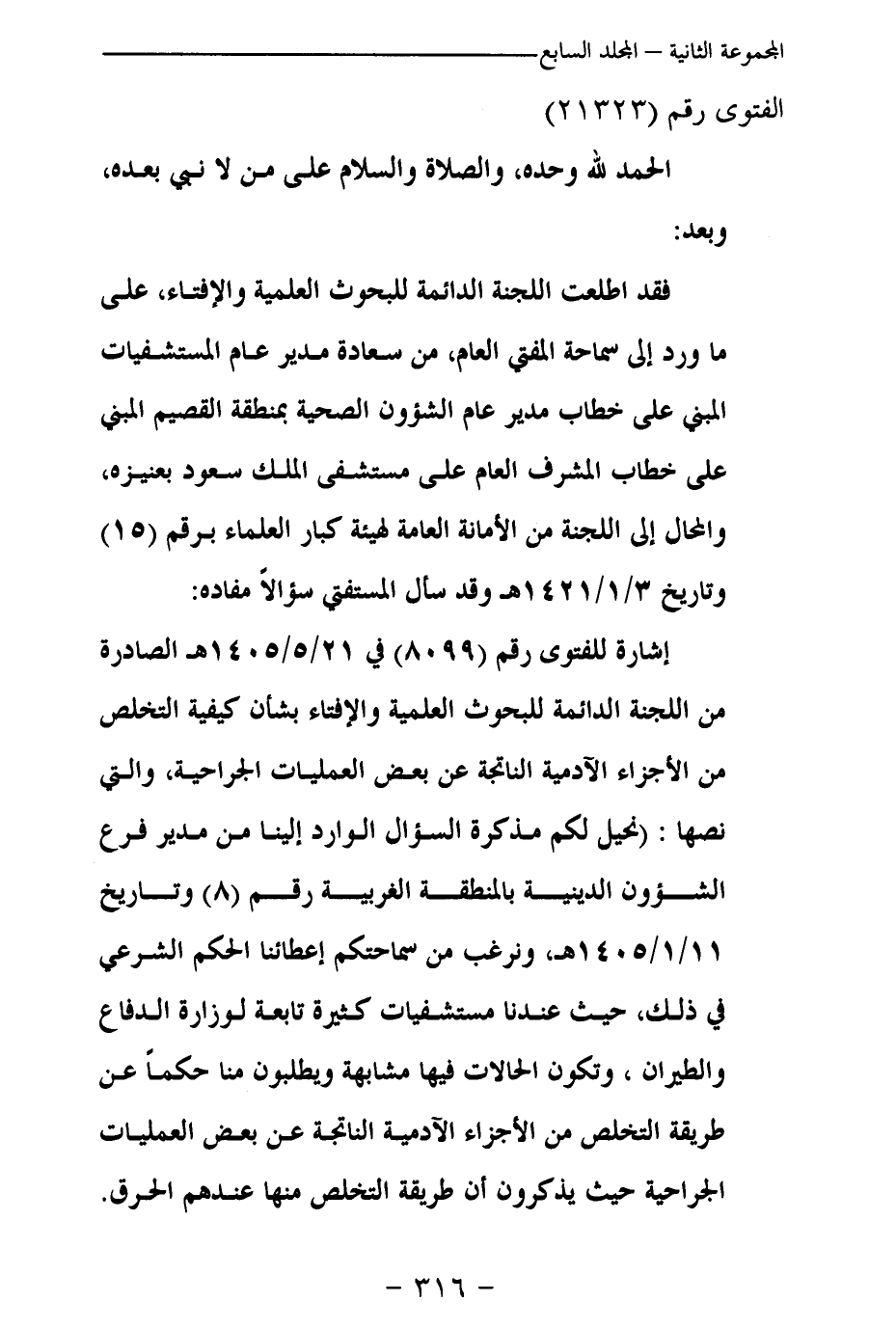 إشارة للفتوى رقم (8099) في 21 / 5 / 1405 هـ الصادرة من اللجنة الدائمة للبحوث العلمية والإفتاء بشأن كيفية التخلص من الأجزاء الآدمية الناتجة عن بعض العمليات الجراحية، والتي نصها: (نحيل لكم مذكرة السؤال الوارد إلينا من مدير فرع الشؤون الدينية بالمنطقة الغربية رقم (8) وتاريخ 11 / 1 / 1405 هـ، وترغب من سماحتكم إعطاءنا الحكم الشرعي في ذلك، حيث عندنا مستشفيات كثيرة تابعة لوزارة الدفاع والطيران، وتكون الحالات فيها مشابهة ويطلبون منا حكما عن طريقة التخلص من الأجزاء الآدمية الناتجة عن بعض العمليات الجراحية حيث يذكرون أن طريقة التخلص منها عندهم الحرق.