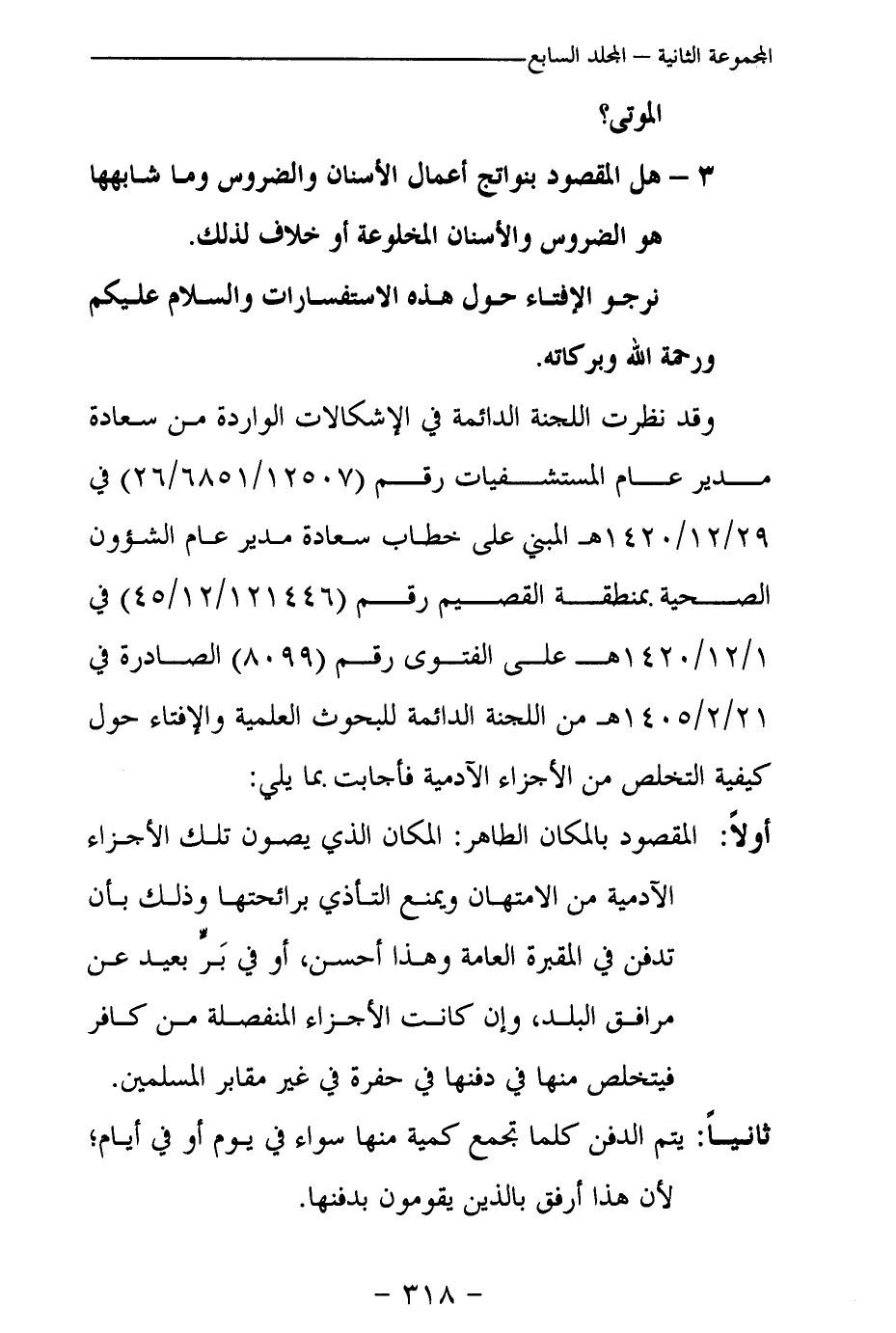 وقد نظرت اللجنة الدائمة في الإشكالات الواردة من سعادة مدير عام المستشفيات رقم (12507 / 6851 / 26) في 29 / 12 / 1420 هـ المبني على خطاب سعادة مدير عام الشؤون الصحية. بمنطقة القصيم رقم (121446 12 / 45) في 1 / 12 / 1420 هـ على الفتوى رقم (8099) الصادرة في 21 / 2 / 1405 هـ من اللجنة الدائمة للبحوث العلمية والإفتاء حول كيفية التخلص من الأجزاء الآدمية فأجابت بما يلي: