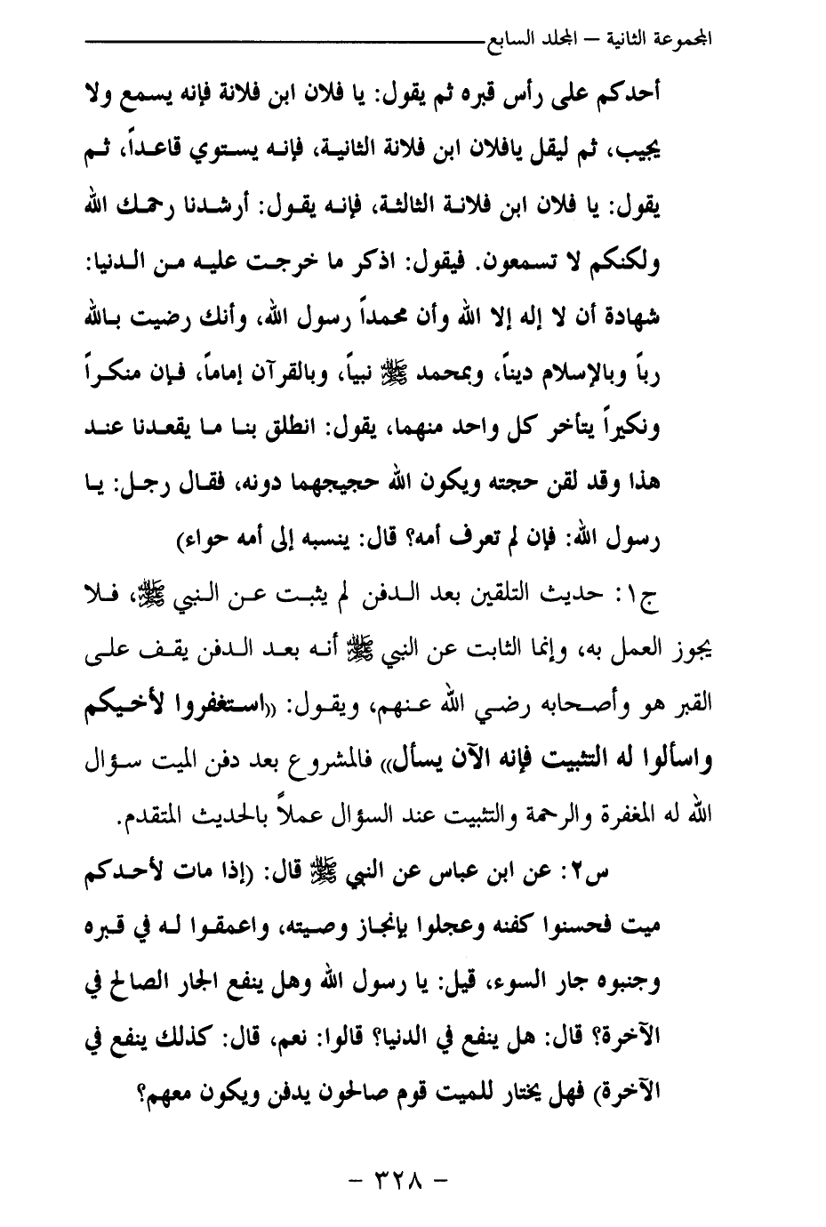 أحدكم على رأس قبره ثم يقول: يا فلان ابن فلانة فإنه يسمع ولا يجيب، ثم ليقل يا فلان بن فلانة الثانية، فإنه يستوي قاعدا، ثم يقول: يا فلان ابن فلانة الثالثة، فإنه يقول: أرشدنا رحمك الله ولكنكم لا تسمعون. فيقول: اذكر ما خرجت عليه من الدنيا: شهادة أن لا إله إلا الله وأن محمدا رسول الله، وأنك رضيت بالله ربا وبالإسلام دينا، وبمحمد - صلى الله عليه وسلم – نبيا، وبالقرآن إماما، فإن منكرا ونكيرا يتأخر كل واحد منهما، يقول: انطلق بنا ما يقعدنا عند هذا وقد لقن حجته ويكون الله حجيجهما دونه، فقال رجل: يا رسول الله: فإن لم تعرف أمه؟ قال: ينسبه إلى أمه حواء» ؟