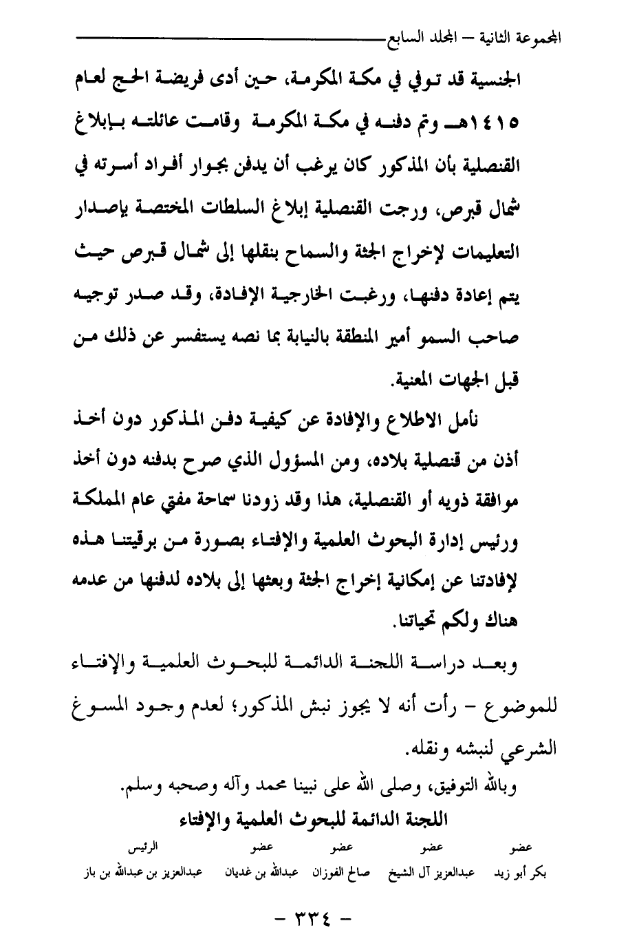 وبعد دراسة اللجنة الدائمة للبحوث العلمية والإفتاء للموضوع – رأت أنه لا يجوز نبش المذكور؛ لعدم وجود المسوغ الشرعي لنبشه ونقله.