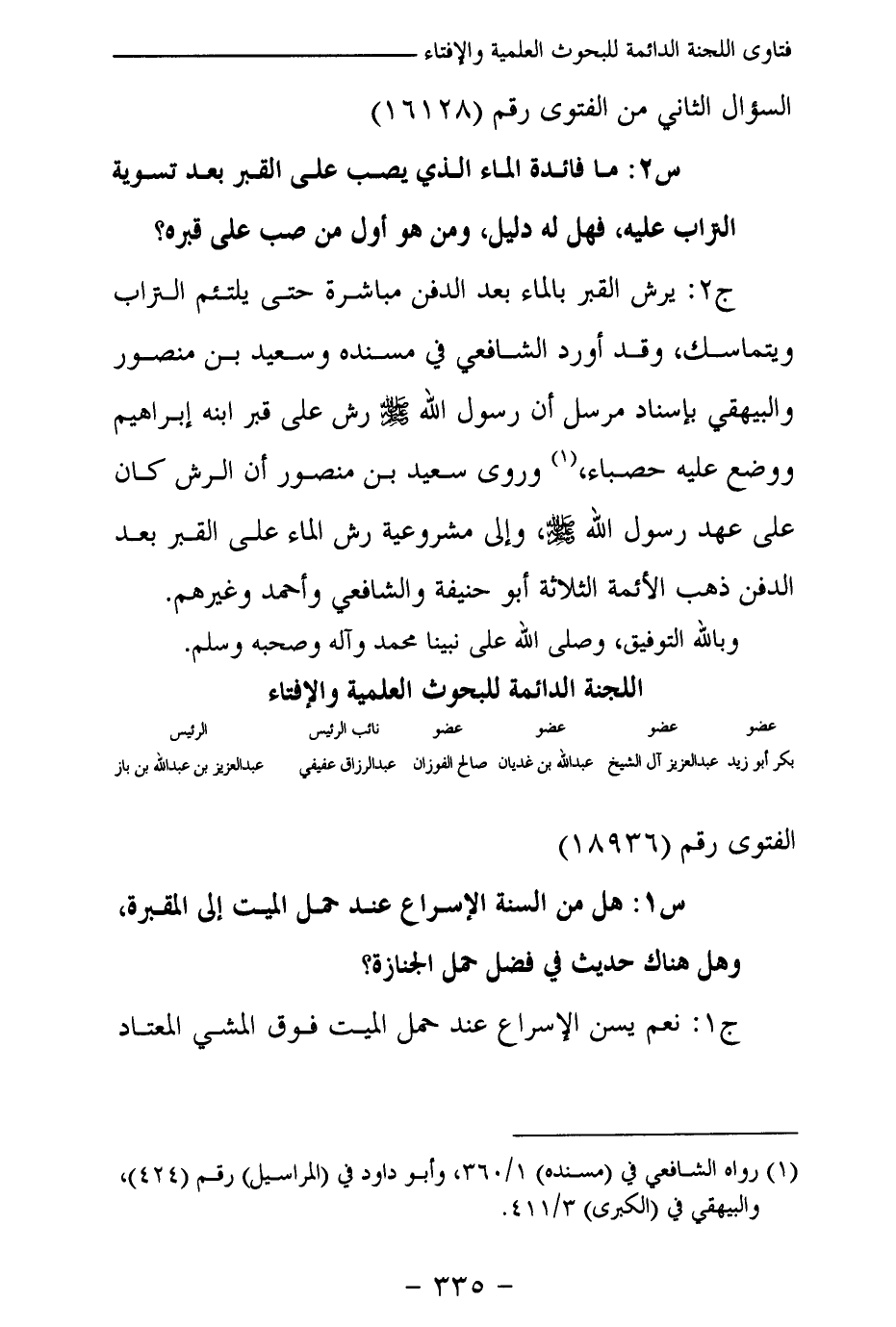 ج 2: يرش القبر بالماء بعد الدفن مباشرة حتى يلتئم التراب ويتماسك، وقد أورد الشافعي في مسنده وسعيد بن منصور والبيهقي بإسناد مرسل «أن رسول الله - صلى الله عليه وسلم – رش على قبر ابنه إبراهيم ووضع عليه حصباء (¬1) » وروى سعيد بن منصور أن الرش كان على عهد رسول الله - صلى الله عليه وسلم -، وإلى مشروعية رش الماء على القبر بعد الدفن ذهب الأئمة الثلاثة أبو حنيفة والشافعي وأحمد وغيرهم.