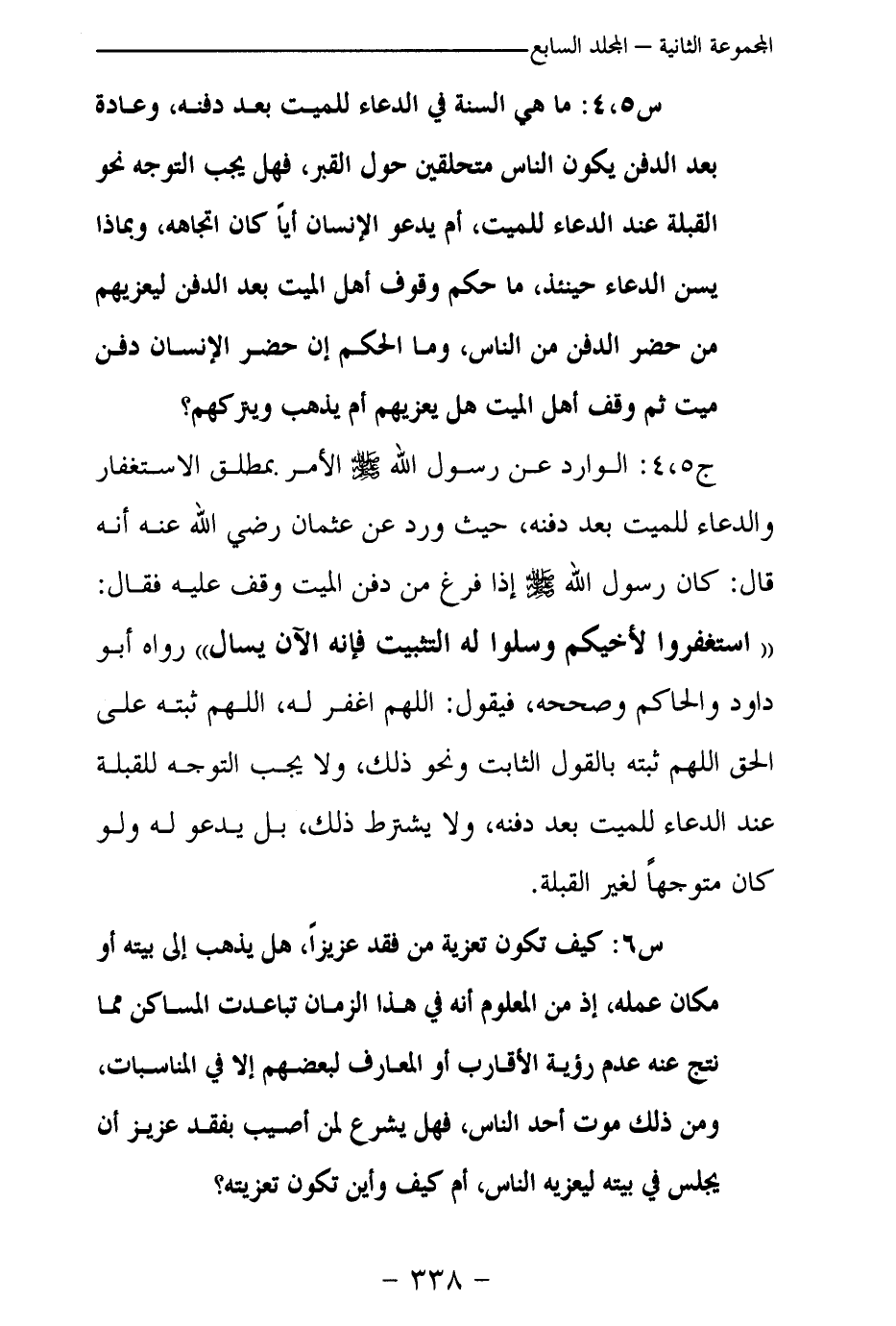 س 5، 4: ما هي السنة في الدعاء للميت بعد دفنه، وعادة بعد الدفن يكون الناس متحلقين حول القبر، فهل يجب التوجه نحو القبلة عند الدعاء للميت، أم يدعو الإنسان أيا كان اتجاهه، وبماذا يسن الدعاء حينئذ، ما حكم وقوف أهل الميت بعد الدفن ليعزيهم من حضر الدفن من الناس، وما الحكم إن حضر الإنسان دفن ميت ثم وقف أهل الميت هل يعزيهم أن يذهب ويتركهم؟