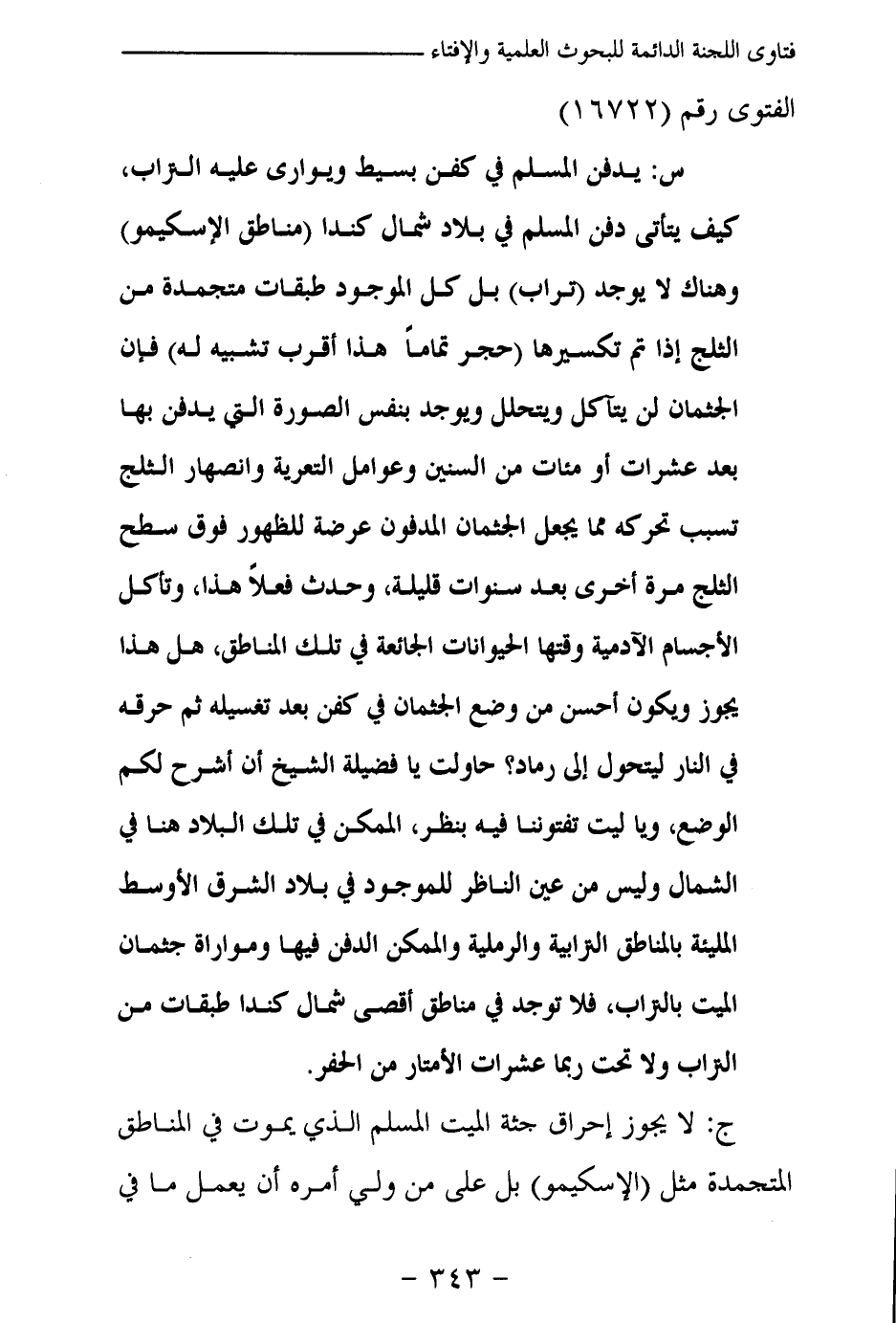 س: يدفن المسلم في كفن بسيط ويوارى عليه التراب، كيف يتأتى دفن المسلم في بلاد شمال كندا (مناطق الإسكيمو) وهناك لا يوجد (تراب) بل كل الموجود طبقات متجمدة من الثلج إذا تم تكسيرها (حجر تماما هذا أقرب تشبيه له) فإن الجثمان لن يتأكل ويتحلل ويوجد بنفس الصورة التي يدفن بها بعد عشرات أو مئات من السنين وعوامل التعرية وانصهار الثلج تسبب تحركه مما يجعل الجثمان المدفون عرضة للظهور فوق سطح الثلج مرة أخرى بعد سنوات قليلة، وحدث فعلا هذا، وتأكل الأجسام الآدمية وقتها الحيوانات الجائعة في تلك المناطق، هل هذا يجوز ويكون أحسن من وضع الجثمان في كفن بعد تغسيله ثم حرقه في النار ليتحول إلى رماد؟ حاولت يا فضيلة الشيخ أن أشرح لكم الوضع، ويا ليت تفتوننا فيه بنظر، الممكن في تلك البلاد هنا في الشمال وليس من عين الناظر للموجود في بلاد الشرق الأوسط المليئة بالمناطق الترابية والرملية والممكن الدفن فيها ومواراة جثمان الميت بالتراب، فلا توجد في مناطق أقصى شمال كندا طبقات من التراب ولا تحت ربما عشرات الأمتار من الحفر؟