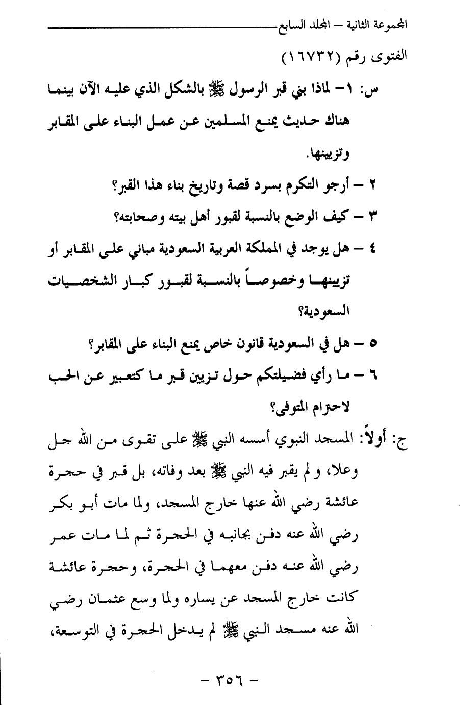 ج: أولا: المسجد النبوي أسسه النبي - صلى الله عليه وسلم – على تقوى من الله جل وعلا، ولم يقبر فيه النبي - صلى الله عليه وسلم – بعد وفاته، بل قبر في حجرة عائشة رضي الله عنها خارج المسجد، ولما مات أبو بكر رضي الله عنه دفن بجانبه في الحجرة ثم لما مات عمر رضي الله عنه دفن معهما في الحجرة، وحجرة عائشة كانت خارج المسجد عن يساره ولما وسع عثمان رضي الله عنه مسجد النبي - صلى الله عليه وسلم – لم يدخل الحجرة في التوسعة،