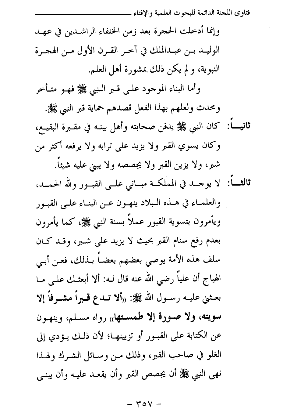 ثالثا: لا يوجد في المملكة مبان على القبور ولله الحمد، والعلماء في هذه البلاد ينهون عن البناء على القبور ويأمرون بتسوية القبور عملا بسنة النبي - صلى الله عليه وسلم -، كما يأمرون بعدم رفع سنام القبر بحيث لا يزيد على شبر، وقد كان سلف هذه الأمة يوصي بعضهم بعضا بذلك، فعن أبي الهياج أن عليا رضي الله عنه قال له: ألا أبعثك على ما بعثني عليه رسول الله - صلى الله عليه وسلم -: «ألا تدع قبرا مشرفا إلا سويته، ولا صورة إلا طمستها (¬1) » رواه مسلم، وينهون عن الكتابة على القبور أو تزيينها؛ لأن ذلك يؤدي إلى الغلو في صاحب القبر، وذلك من وسائل الشرك ولهذا نهى النبي - صلى الله عليه وسلم – أن يجصص القبر وأن يقعد عليه وأن يبنى