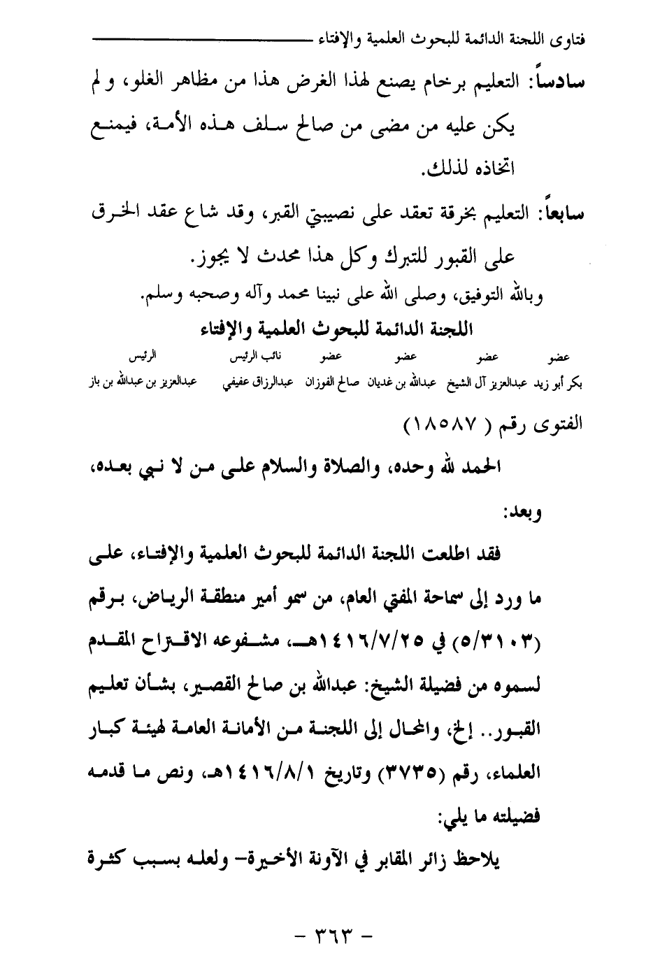 فقد اطلعت اللجنة الدائمة للبحوث العلمية والإفتاء، على ما ورد إلى سماحة المفتي العام، من سمو أمير منطقة الرياض، برقم (3103 5) في 25 / 7 / 1416 هـ، مشفوعه الاقتراح المقدم لسموه من فضيلة الشيخ: عبد الله بن صالح القصير، بشأن تعليم القبور ... إلخ، والمحال إلى اللجنة من الأمانة العامة لهيئة كبار العلماء، رقم (3735) وتاريخ 1 / 8 / 1416 هـ، ونص ما قدمه فضيلته ما يلي: