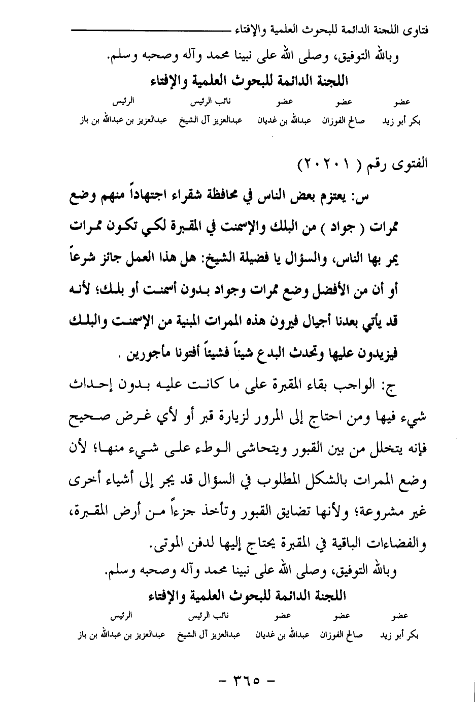 ج: الواجب بقاء المقبرة على ما كانت عليه بدون إحداث شيء فيها، ومن احتاج إلى المرور لزيارة قبر أو لأي غرض صحيح فإنه يتخلل من بين القبور ويتحاشى الوطء على شيء منها؛ لأن وضع الممرات بالشكل المطلوب في السؤال قد يجر إلى أشياء أخرى غير مشروعة؛ ولأنها تضايق القبور وتأخذ جزءا من أرض المقبرة والفضاءات الباقية في المقبرة يحتاج إليها لدفن الموتى.
