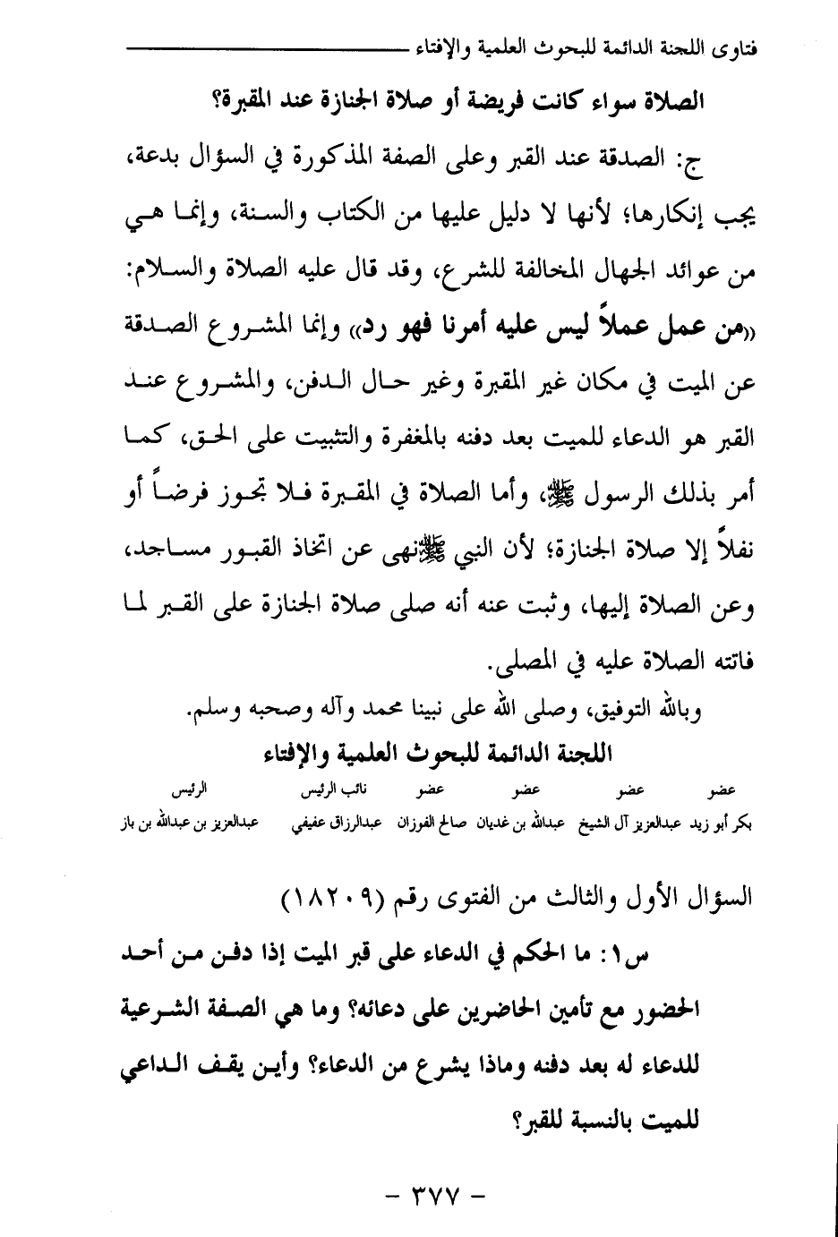 ج: الصدقة عند القبر وعلى الصفة المذكورة في السؤال بدعة، يجب إنكارها؛ لأنها لا دليل عليها من الكتاب والسنة، وإنما هي من عوائد الجهال المخالفة للشرع، وقد قال عليه الصلاة والسلام: «من عمل عملا ليس عليه أمرنا فهو رد (¬1) » وإنما المشروع الصدقة عن الميت في مكان غير المقبرة وغير حال الدفن، والمشروع عند القبر هو الدعاء للميت بعد دفنه بالمغفرة والتثبيت على الحق، كما أمر بذلك الرسول - صلى الله عليه وسلم -، وأما الصلاة في المقبرة فلا تجوز فرضا أو نفلا إلا صلاة الجنازة؛ لأن النبي - صلى الله عليه وسلم – نهى عن اتخاذ القبور مساجد، وعن الصلاة إليها، وثبت عنه أنه صلى صلاة الجنازة على القبر لما فاتته الصلاة عليه في المصلى.