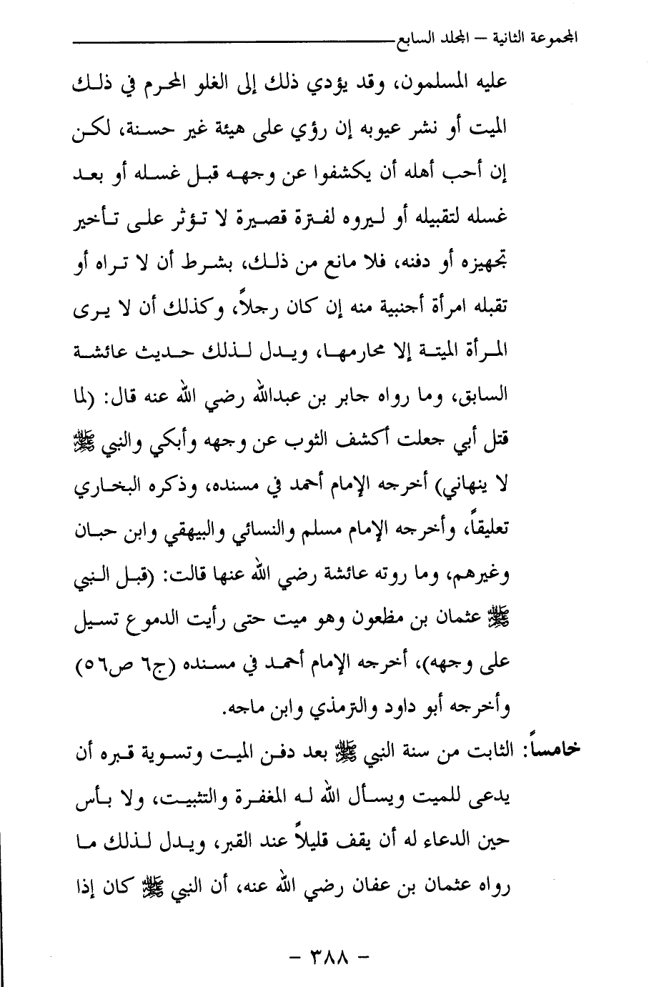 عليه المسلمون، وقد يؤدي ذلك إلى الغلو المحرم في ذلك الميت أو نشر عيوبه إن رؤي على هيئة غير حسنة، لكن إن أحب أهله أن يكشفوا عن وجهه قبل غسله أو بعد غسله لتقبيله أو ليروه لفترة قصيرة لا تؤثر على تأخير تجهيزه أو دفنه، فلا مانع من ذلك، بشرط أن لا تراه أو تقبله امرأة أجنبية منه إن كان رجلا، وكذلك أن لا يرى المرأة الميتة إلا محارمها، ويدل لذلك حديث عائشة السابق، وما رواه جابر بن عبد الله رضي الله عنه قال: «لما قتل أبي جعلت أكشف الثوب عن وجهه وأبكي والنبي - صلى الله عليه وسلم – لا ينهاني (¬1) » أخرجه الإمام أحمد في مسنده، وذكره البخاري تعليقا، وأخرجه الإمام مسلم والنسائي والبيهقي وابن حبان وغيرهم، وما روته عائشة رضي الله عنها قالت: «قبل النبي - صلى الله عليه وسلم – عثمان بن مظعون وهو ميت حتى رأيت الدموع تسيل على وجهه (¬2) » أخرجه الإمام أحمد في مسنده (ج 6 ص 56) وأخرجه أبو داود والترمذي وابن ماجه.