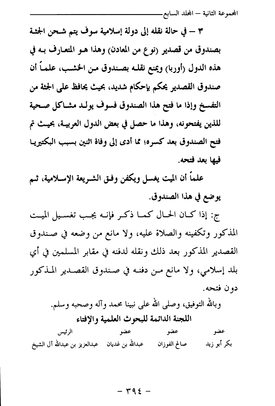 ج: إذا كان الحال كما ذكر فإنه يجب تغسيل الميت المذكور وتكفينه والصلاة عليه ولا مانع من وضعه في صندوق القصدير المذكور بعد ذلك ونقله لدفنه في مقابر المسلمين في أي بلد إسلامي، ولا مانع من دفنه في صندوق القصدير المذكور دون فتحه.