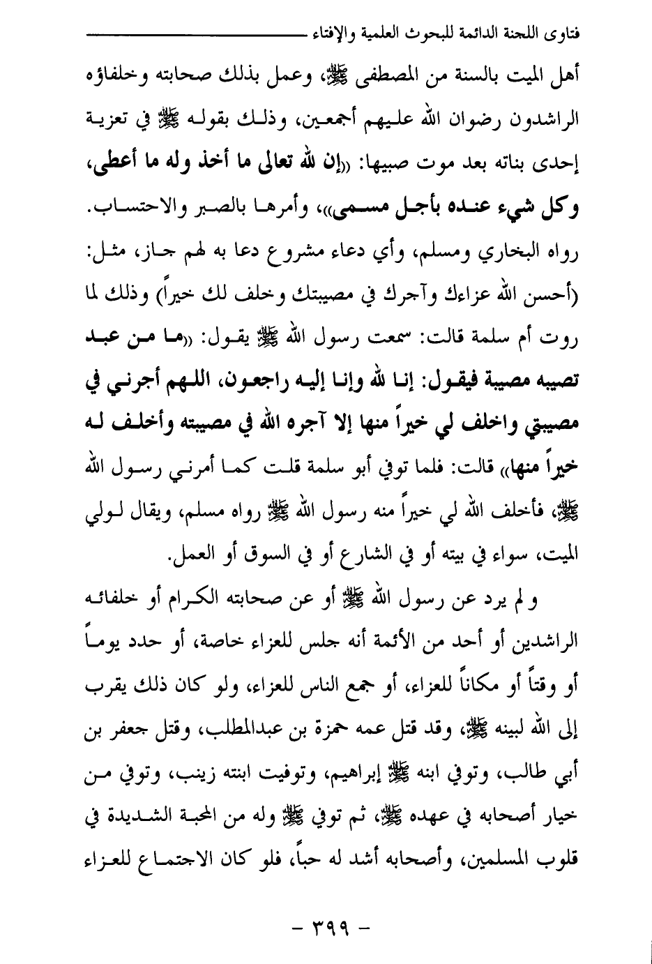 ولم يرد عن رسول الله - صلى الله عليه وسلم – أو عن صحابته الكرام أو خلفائه الراشدين أو أحد من الأئمة أنه جلس للعزاء خاصة، أو حدد يوما أو وقتا أو مكانا للعزاء، أو جمع الناس للعزاء، ولو كان ذلك يقرب إلى الله لبينه - صلى الله عليه وسلم -، وقد قتل عمه حمزة بن عبد المطلب، وقتل جعفر بن أبي طالب، وتوفي ابنه - صلى الله عليه وسلم - إبراهيم، وتوفيت ابنته زينب، وتوفي من خيار أصحابه في عهده - صلى الله عليه وسلم – ثم توفي - صلى الله عليه وسلم – وله من المحبة الشديدة في قلوب المسلمين، وأصحابه أشد له حبا، فلو كان الاجتماع للعزاء