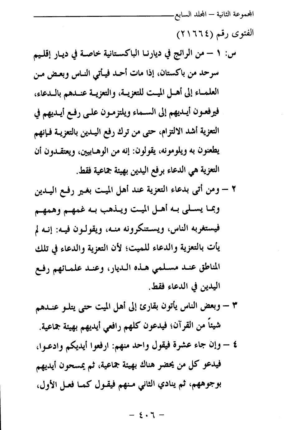 2- ومن أتى بدعاء التعزية عند أهل الميت بغير رفع اليدين وبما يسلى به أهل الميت ويذهب به غمهم وهمهم فيستغربه الناس، ويستنكرونه منه، ويقولون فيه: إنه لم يأت بالتعزية والدعاء للميت؛ لأن التعزية والدعاء في تلك المناطق عند مسلمي هذه الديار، وعند علمائهم رفع اليدين في الدعاء فقط.
