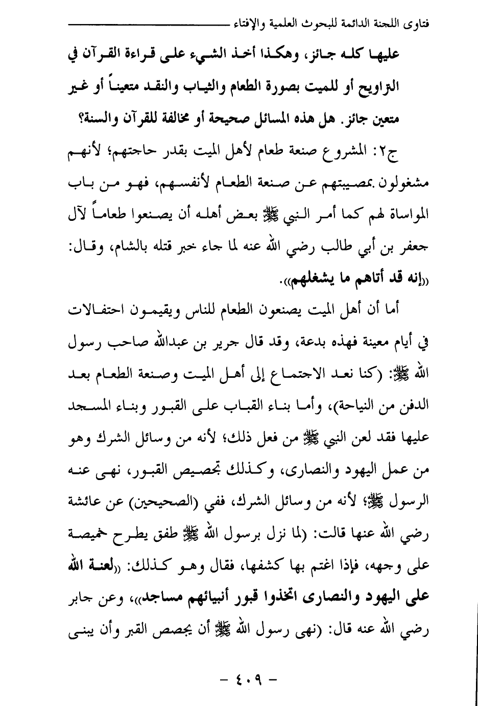 أما أن أهل الميت يصنعون الطعام للناس ويقيمون احتفالات في أيام معينة فهذه بدعة، وقد قال جرير بن عبد الله صاحب رسول الله - صلى الله عليه وسلم –: (كنا نعد الاجتماع إلى أهل الميت وصنعة الطعام بعد الدفن من النياحة) ، وأما بناء القباب على القبور وبناء المسجد عليها فقد لعن النبي - صلى الله عليه وسلم – من فعل ذلك؛ لأنه من وسائل الشرك وهو من عمل اليهود والنصارى، وكذلك تجصيص القبور، نهى عنه الرسول - صلى الله عليه وسلم -؛ لأنه من وسائل الشرك، ففي (الصحيحين) عن عائشة رضي الله عنها قالت: «لما نزل برسول الله - صلى الله عليه وسلم – طفق يطرح خميصة على وجهه، فإذا اغتم بها كشفها، فقال وهو كذلك: لعنة الله على اليهود والنصارى اتخذوا قبور أنبيائهم مساجد (¬2) » وعن جابر رضي الله عنه قال: «نهى رسول الله - صلى الله عليه وسلم – أن يجصص القبر وأن يبنى