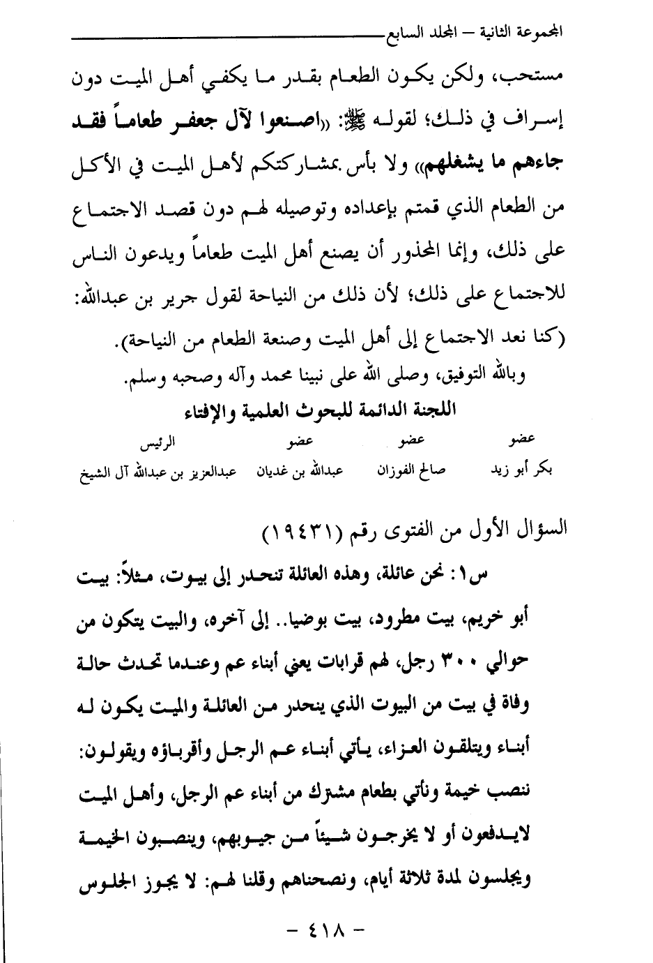 س 1: نحن عائلة، وهذه العائلة تنحدر إلى بيوت مثلا: بيت أبو خريم، بيت مطرود، بيت بوضيا.. إلى آخره، والبيت يتكون من حوالي 300 رجل، لهم قرابات يعني أبناء عم وعندما تحدث حالة وفاة في بيت من البيوت الذي ينحدر من العائلة والميت يكون له أبناء ويتلقون العزاء، يأتي أبناء عم الرجل وأقرباؤه ويقولون: ننصب خيمة ونأتي بطعام مشترك من أبناء عم الرجل، وأهل الميت لا يدفعون أو لا يخرجون شيئا من جيوبهم، وينصبون الخيمة ويجلسون لمدة ثلاثة أيام، ونصحناهم وقلنا لهم: لا يجوز الجلوس