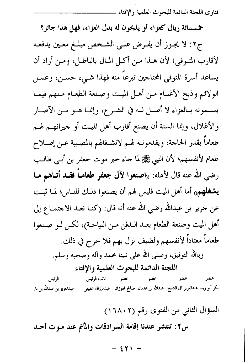 ج 2: لا يجوز أن يفرض على الشخص مبلغ معين يدفعه لأقارب المتوفى؛ لأن هذا من أكل المال بالباطل، ومن أراد أن يساعد أسرة المتوفى المحتاجين تبرعا منه فهذا شيء حسن، وعمل الولائم وذبح الأغنام من أهل الميت وصنعة الطعام منهم فيما يسمونه بالعزاء لا أصل له في الشرع، وإنما هو من الآصار والأغلال، وإنما السنة أن يصنع أقارب أهل الميت أو جيرانهم لهم طعاما بقدر الحاجة، ويقدمونه لهم لانشغالهم بالمصيبة عن إصلاح طعام لأنفسهم؛ لأن النبي - صلى الله عليه وسلم – لما جاء خبر موت جعفر بن أبي طالب رضي الله عنه قال لأهله: «اصنعوا لآل جعفر طعاما فقد أتاهم ما يشغلهم (¬1) » أما أهل الميت فليس لهم أن يصنعوا ذلك للناس؛ لما ثبت عن جرير بن عبد الله رضي الله عنه أنه قال: (كنا نعد الاجتماع إلى أهل الميت وصنعة الطعام بعد الدفن من النياحة) ، لكن لو صنعوا طعاما معتادا لأنفسهم ولضيف نزل بهم فلا حرج في ذلك.