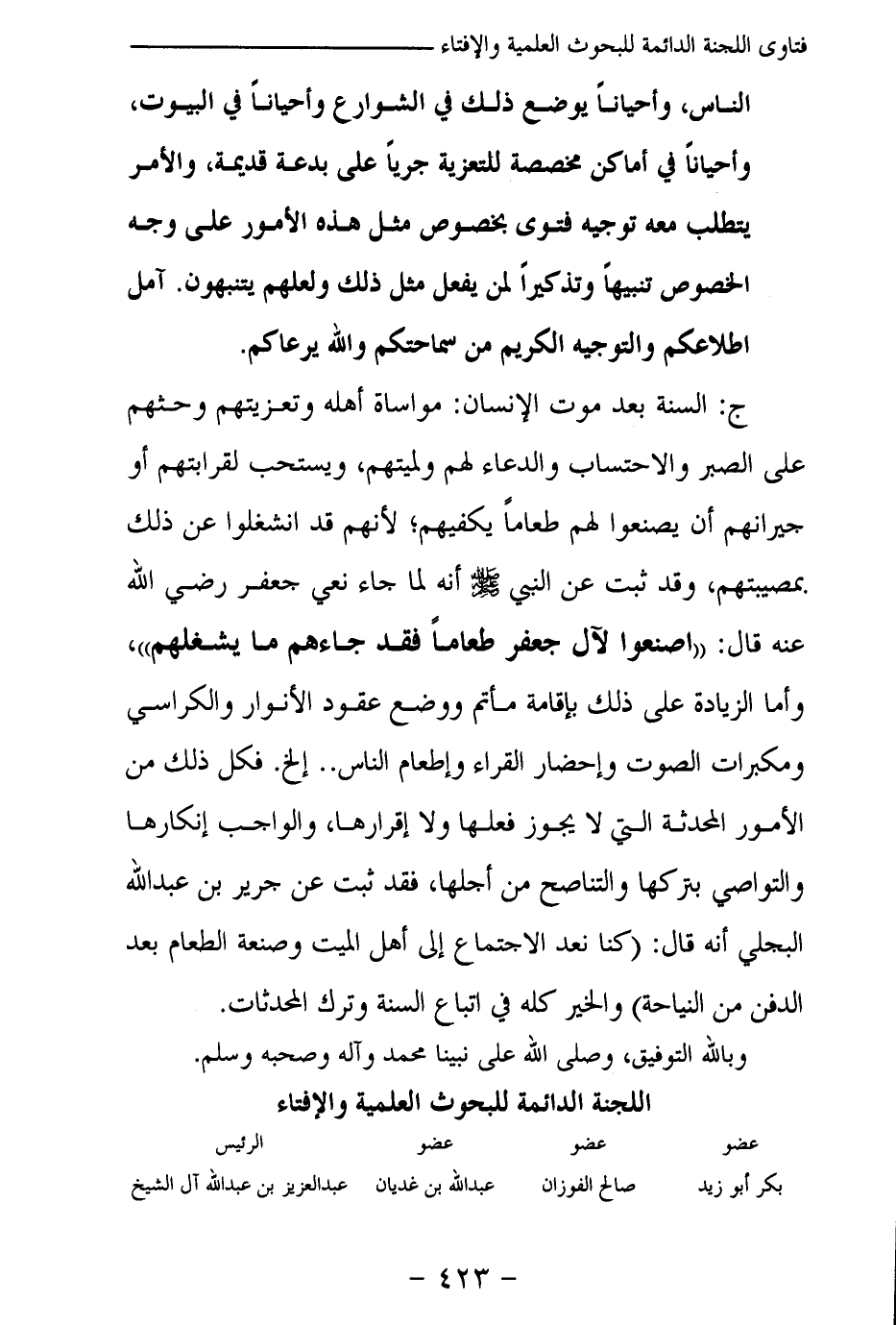 ج: السنة بعد موت الإنسان: مواساة أهله وتعزيتهم وحثهم على الصبر والاحتساب والدعاء لهم ولميتهم، ويستحب لقرابتهم أو جيرانهم أن يصنعوا لهم طعاما يكفيهم؛ لأنهم قد انشغلوا عن ذلك بمصيبتهم، وقد ثبت عن النبي - صلى الله عليه وسلم – أنه لما جاء نعي جعفر رضي الله عنه قال: «اصنعوا لآل جعفر طعاما، فقد جاءهم ما يشغلهم (¬1) » وأما الزيادة على ذلك بإقامة مأتم ووضع عقود الأنوار والكراسي ومكبرات الصوت وإحضار القراء وإطعام الناس.. إلخ. فكل ذلك من الأمور المحدثة التي لا يجوز فعلها ولا إقرارها، والواجب إنكارها والتواصي بتركها والتناصح من أجلها، فقد ثبت عن جرير بن عبد الله البجلي أنه قال: (كنا نعد الاجتماع إلى أهل الميت وصنعة الطعام بعد الدفن من النياحة) والخير كله في اتباع السنة وترك المحدثات.