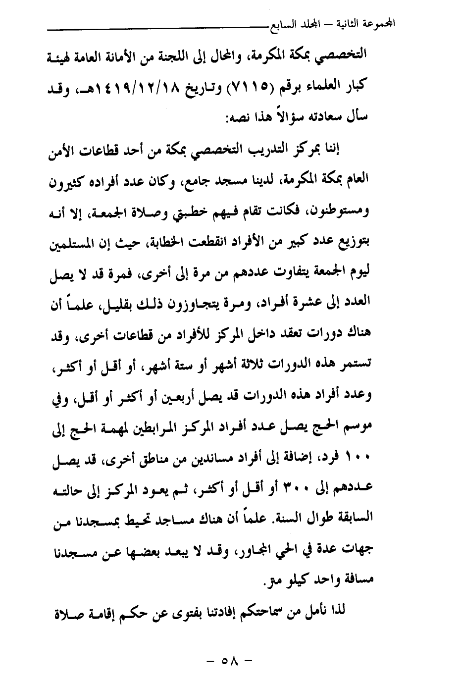 إننا بمركز التدريب التخصصي بمكة من أحد قطاعات الأمن العام بمكة المكرمة، لدينا مسجد جامع، وكان عدد أفراده كثيرين ومستوطنين، فكانت تقام فيهم خطبتي وصلاة الجمعة، إلا أنه بتوزيع عدد كبير من الأفراد انقطعت الخطابة، حيث إن المستلمين ليوم الجمعة يتفاوت عددهم من مرة إلى أخرى، فمرة قد لا يصل العدد إلى عشرة أفراد، ومرة يتجاوزون ذلك بقليل، علما أن هناك دورات تعقد داخل المركز للأفراد من قطاعات أخرى ـ وقد تستمر هذه الدورات ثلاثة أشهر أو ستة أشهر، أو أقل أو أكثر، وعدد أفراد هذه الدورات قد يصل أربعين أو أكثر أو أقل، وفي موسم الحج يصل عدد أفراد المركز المرابطين لمهمة الحج إلى 100 فرد، إضافة إلى أفراد مساندين من مناطق أخرى، قد يصل عددهم إلى 300 أو أقل أو أكثر، ثم يعود المركز إلى حالته السابقة طوال السنة. علما أن هناك مساجد تحيط بمسجدنا من جهات عدة في الحي المجاور، وقد لا يبعد بعضها عن مسجدنا مسافة واحد كيلو متر.