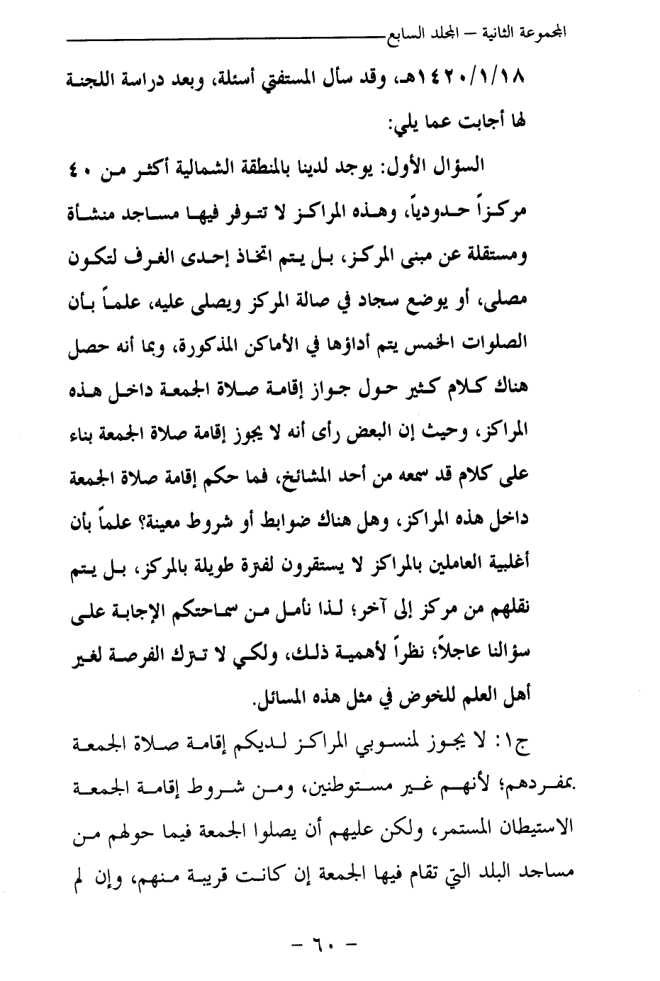 السؤال الأول: يوجد لدينا بالمنطقة الشمالية أكثر من 40 مركزا حدوديا، وهذه المراكز لا تتوافر فيها مساجد منشأة ومستقلة عن مبنى المركز، بل يتم اتخاذ إحدى الغرف لتكون مصلى، أو يوضع سجاد في صالة المركز ويصلى عليه، علما بأن الصلوات الخمس يتم أداؤها في الأماكن المذكورة، وبما أنه حصل هناك كلام كثير حول جواز إقامة صلاة الجمعة داخل هذه المراكز وحيث إن البعض رأى أنه لا يجوز إقامة صلاة الجمعة بناء على كلام قد سمعه من أحد المشائخ، فما حكم إقامة صلاة الجمعة داخل هذه المراكز، وهل هناك ضوابط أو شروط معينة؟ علما بأن أغلبية العاملين بالمراكز لا يستقرون لفترة طويلة بالمركز، بل يتم نقلهم من مركز إلى آخر؛ لذا نأمل من سماحتكم الإجابة على سؤالنا عاجلا؛ نظرا لأهمية ذلك، ولكي لا تترك الفرصة لغير أهل العلم للخوض في مثل هذه المسائل؟