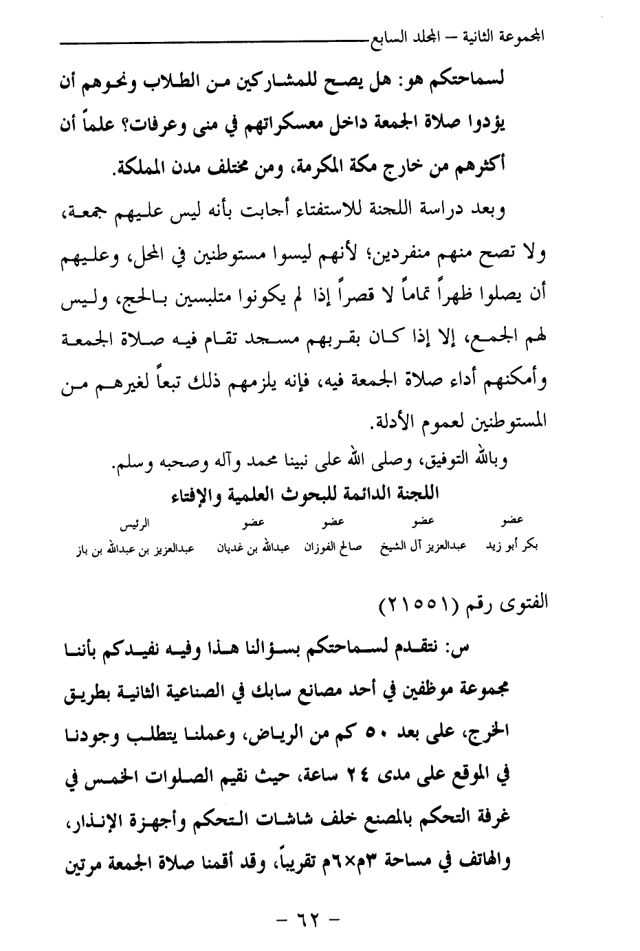 وبعد دراسة اللجنة للاستفتاء أجابت بأنه ليس عليهم جمعة، ولا تصح منهم منفردين؛ لأنهم ليسوا مستوطنين في المحل، وعليهم أن يصلوا ظهرا تماما لا قصرا إذا لم يكونوا متلبسين بالحج، وليس لهم الجمع، إلا إذا كان بقربهم مسجد تقام فيه صلاة الجمعة وأمكنهم أداء صلاة الجمعة فيه، فإنه يلزمهم ذلك تبعا لغيرهم من المستوطنين لعموم الأدلة.