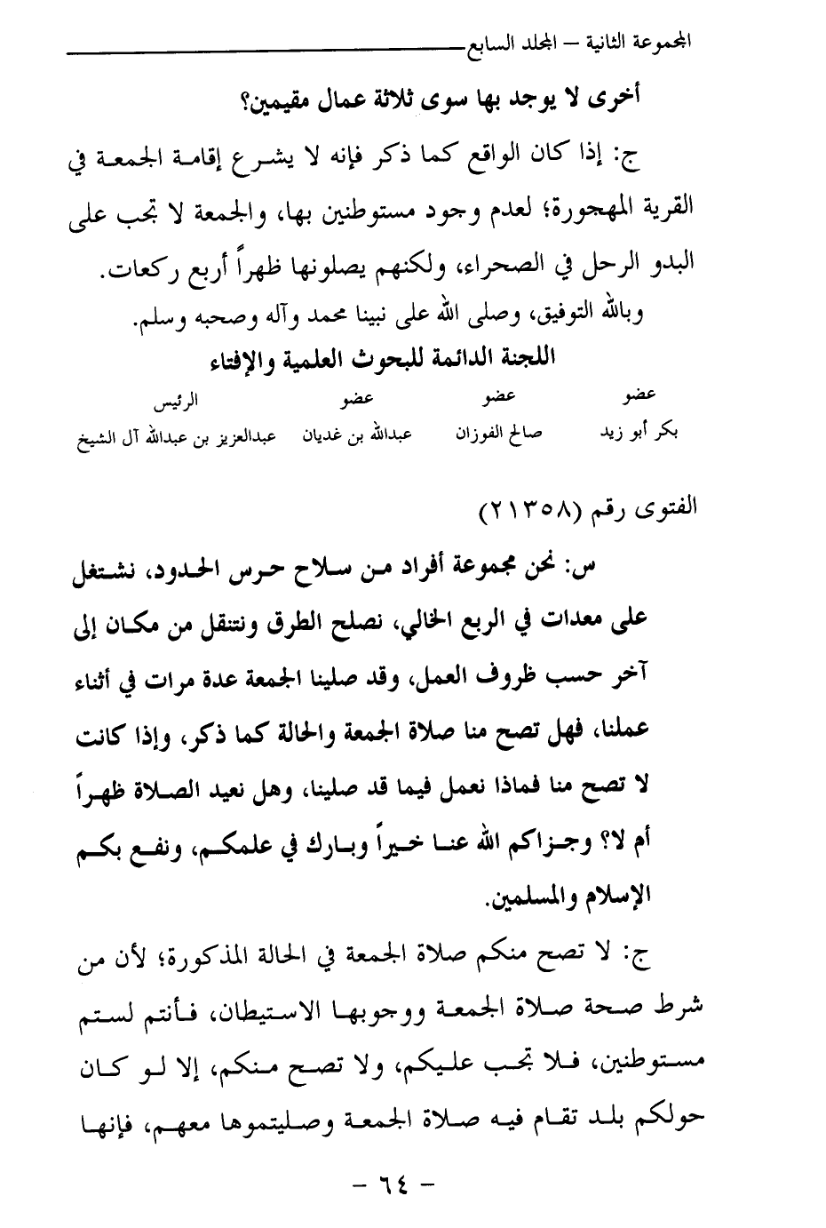 س: نحن مجموعة أفراد من سلاح حرس الحدود، نشتغل على معدات في الربع الخالي، نصلح الطرق ونتنقل من مكان إلى آخر حسب ظروف العمل، وقد صلينا الجمعة عدة مرات في أثناء عملنا، فهل تصح منا صلاة الجمعة والحالة كما ذكر، وإذا كانت لا تصح منا فماذا نعمل فيما قد صلينا، وهل نعيد الصلاة ظهرا أم لا؟ وجزاكم الله عنا خيرا وبارك في علمكم، ونفع بكم الإسلام والمسلمين