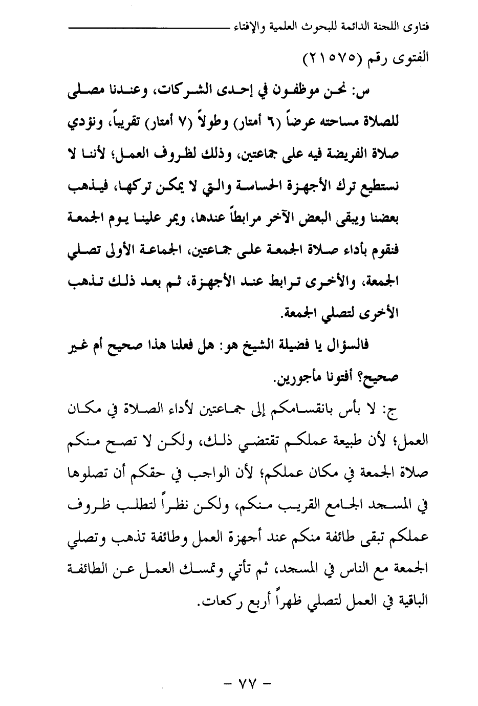 ج: لا بأس بانقسامكم إلى جماعتين لأداء الصلاة في مكان العمل؛ لأن طبيعة عملكم تقتضي ذلك، ولكن لا تصح منكم صلاة الجمعة في مكان عملكم؛ لأن الواجب في حقكم أن تصلوها في المسجد الجامع القريب منكم، ولكن نظرا لتطلب ظروف عملكم تبقى طائفة منكم عند أجهزة العمل وطائفة تذهب وتصلي الجمعة مع الناس في المسجد، ثم تأتي وتمسك العمل عن الطائفة الباقية في العمل لتصلي ظهرا أربع ركعات.