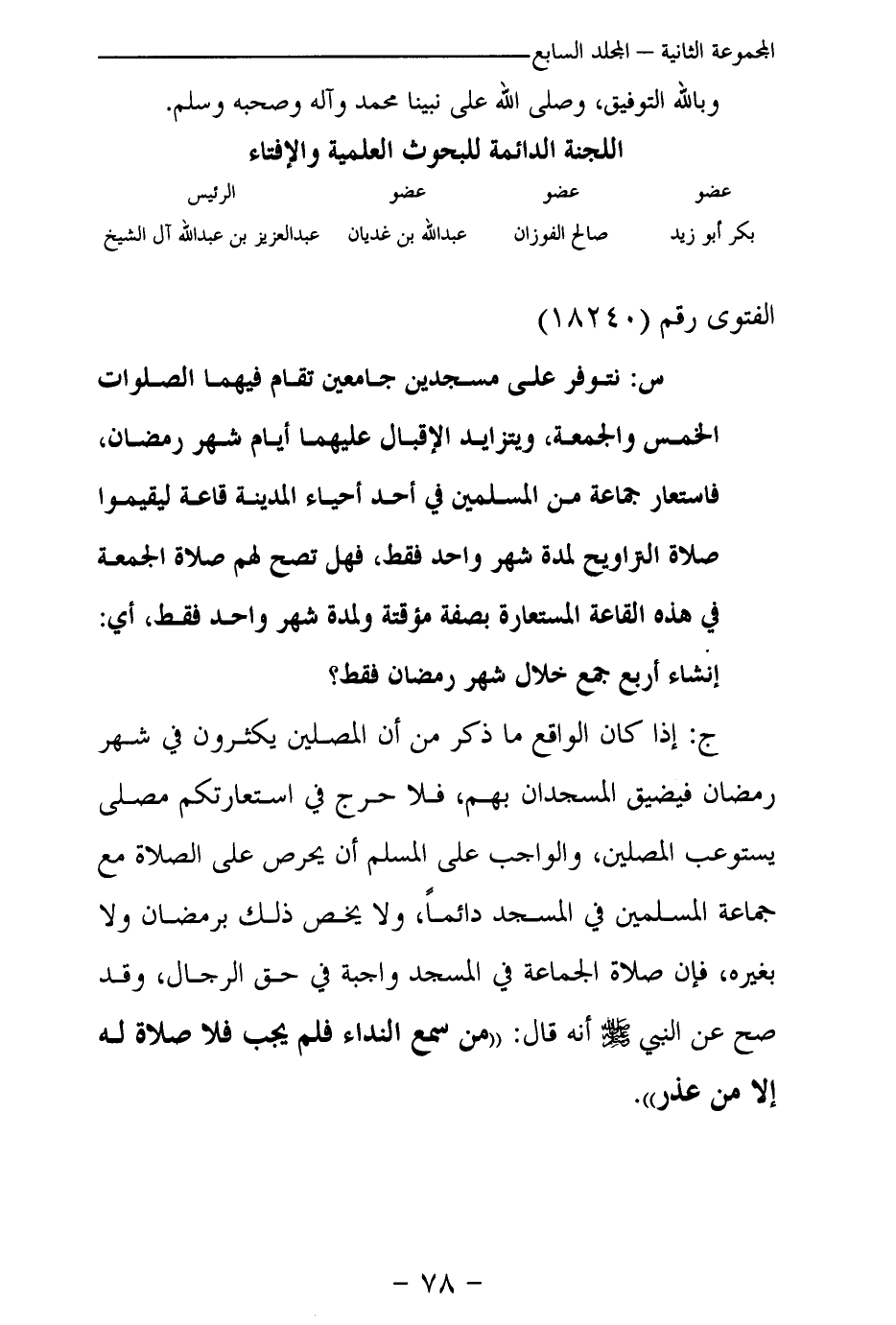 ج: إذا كان الواقع ما ذكر من أن المصلين يكثرون في شهر رمضان فيضيق المسجدان بهم، فلا حرج في استعارتكم مصلى يستوعب المصلين، والواجب على المسلم أن يحرص على الصلاة مع جماعة المسلمين في المسجد دائما، ولا يخص ذلك برمضان ولا بغيره، فإن صلاة الجماعة في المسجد واجبة في حق الرجال، وقد صح عن النبي - صلى الله عليه وسلم – أنه قال: «من سمع النداء فلم يجب فلا صلاة له إلا من عذر (¬1) » .