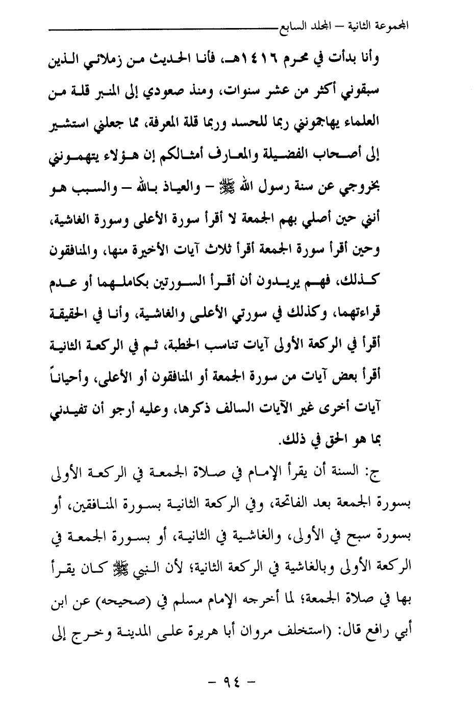 وأنا بدأت في محرم 1416 هـ، فأنا الحديث من زملائي الذين سبقوني أكثر من عشر سنوات، ومنذ صعودي إلى المنبر قلة من العلماء يهاجمونني ربما للحسد وربما قلة المعرفة، مما جعلني أستشير إلى أصحاب الفضيلة والمعارف أمثالكم إن هؤلاء يتهمونني بخروجي عن سنة رسول الله - صلى الله عليه وسلم – والعياذ بالله – والسبب هو أنني حين أصلي بهم الجمعة لا أقرأ سورة الأعلى وسورة الغاشية وحين أقرأ سورة الجمعة أقرأ ثلاث آيات الأخيرة منها، والمنافقون كذلك، فهم يريدون أن أقرأ السورتين بكاملهما أو عدم قراءتهما، وكذلك في سورتي الأعلى والغاشية، وأنا في الحقيقة أقرأ في الركعة الأولى آيات تناسب الخطبة، ثم في الركعة الثانية أقرأ بعض آيات من سورة الجمعة أو المنافقون أو الأعلى، وأحيانا آيات أخرى غير الآيات السالف ذكرها، وعليه أرجو أن تفيدني بما هو الحق في ذلك؟