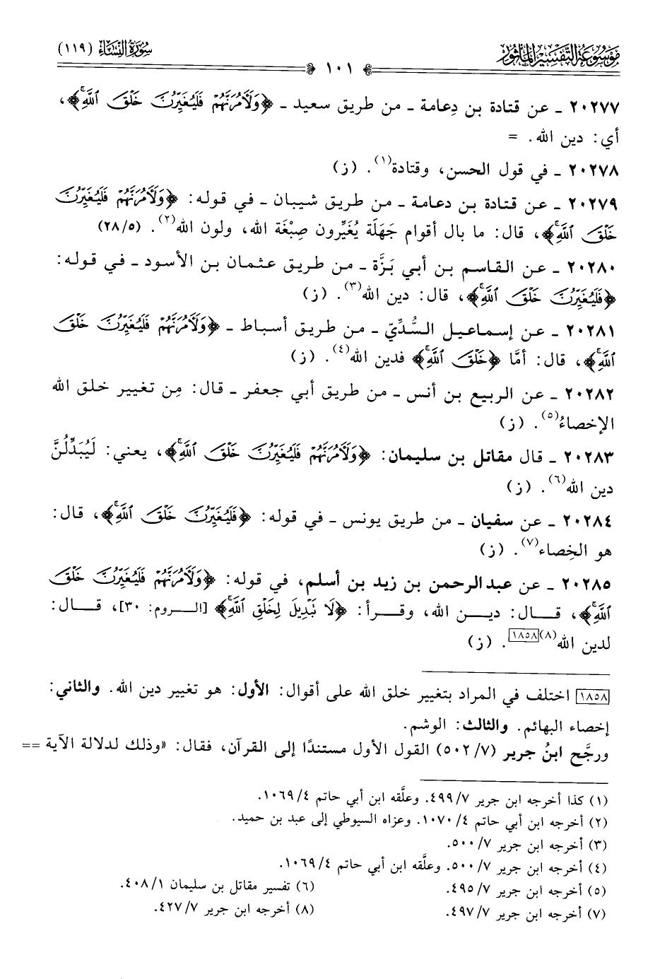 ٢٠٢٨٥ - عن عبد الرحمن بن زيد بن أسلم، في قوله: {ولآمرنهم فليغيرن خلق الله}، قال: دين الله. وقرأ: {لا تبديل لخلق الله} [الروم: ٣٠]. قال: لدين الله (¬٨) [١٨٥٨]. (ز)