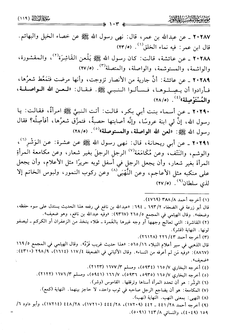 ٢٠٢٨٨ - عن عائشة، قالت: كان رسول الله - صلى الله عليه وسلم - يَلْعن القاشِرَة (¬٢)، والمقشورة، والواشمة، والمستوشمة، والواصلة، والمتصلة (¬٣). (٥/ ٢٧)