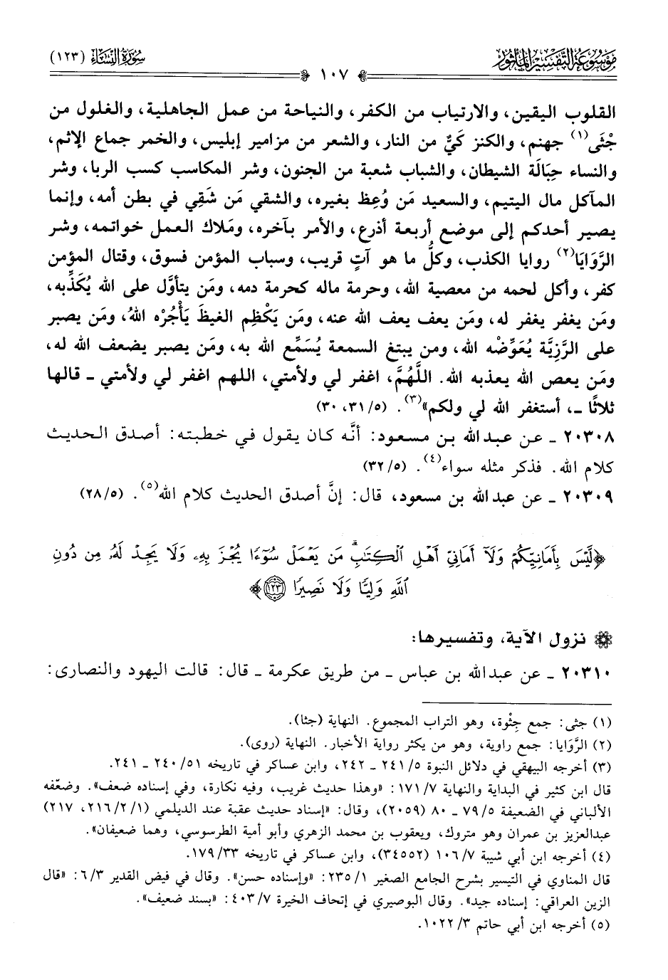 {لَيْسَ بِأَمَانِيِّكُمْ وَلَا أَمَانِيِّ أَهْلِ الْكِتَابِ مَنْ يَعْمَلْ سُوءًا يُجْزَ بِهِ وَلَا يَجِدْ لَهُ مِنْ دُونِ اللَّهِ وَلِيًّا وَلَا نَصِيرًا (١٢٣)}