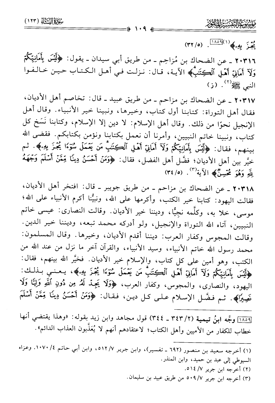 ٢٠٣١٦ - عن الضحاك بن مزاحم -من طريق أبي سيدان- يقول: {ليس بأمانيكم ولا أماني أهل الكتاب} الآية، قال: نزلت في أهل الكتاب حين خالفوا النبي - صلى الله عليه وسلم - (¬٢). (ز)