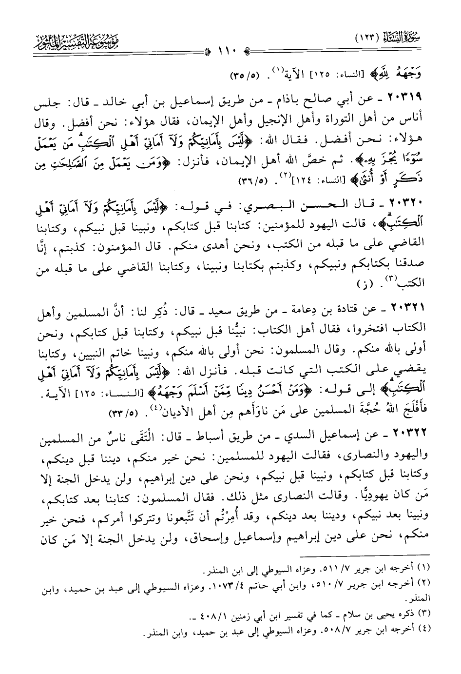 ٢٠٣٢٢ - عن إسماعيل السدي -من طريق أسباط- قال: التَقى ناسٌ من المسلمين واليهود والنصارى، فقالت اليهود للمسلمين: نحن خير منكم، ديننا قبل دينكم، وكتابنا قبل كتابكم، ونبينا قبل نبيكم، ونحن على دين إبراهيم، ولن يدخل الجنة إلا مَن كان يهودِيًّا. وقالت النصارى مثل ذلك. فقال المسلمون: كتابنا بعد كتابكم، ونبينا بعد نبيكم، وديننا بعد دينكم، وقد أُمِرْتُم أن تَتَّبعونا وتتركوا أمركم، فنحن خير منكم، نحن على دين إبراهيم وإسماعيل وإسحاق، ولن يدخل الجنة إلا مَن كان