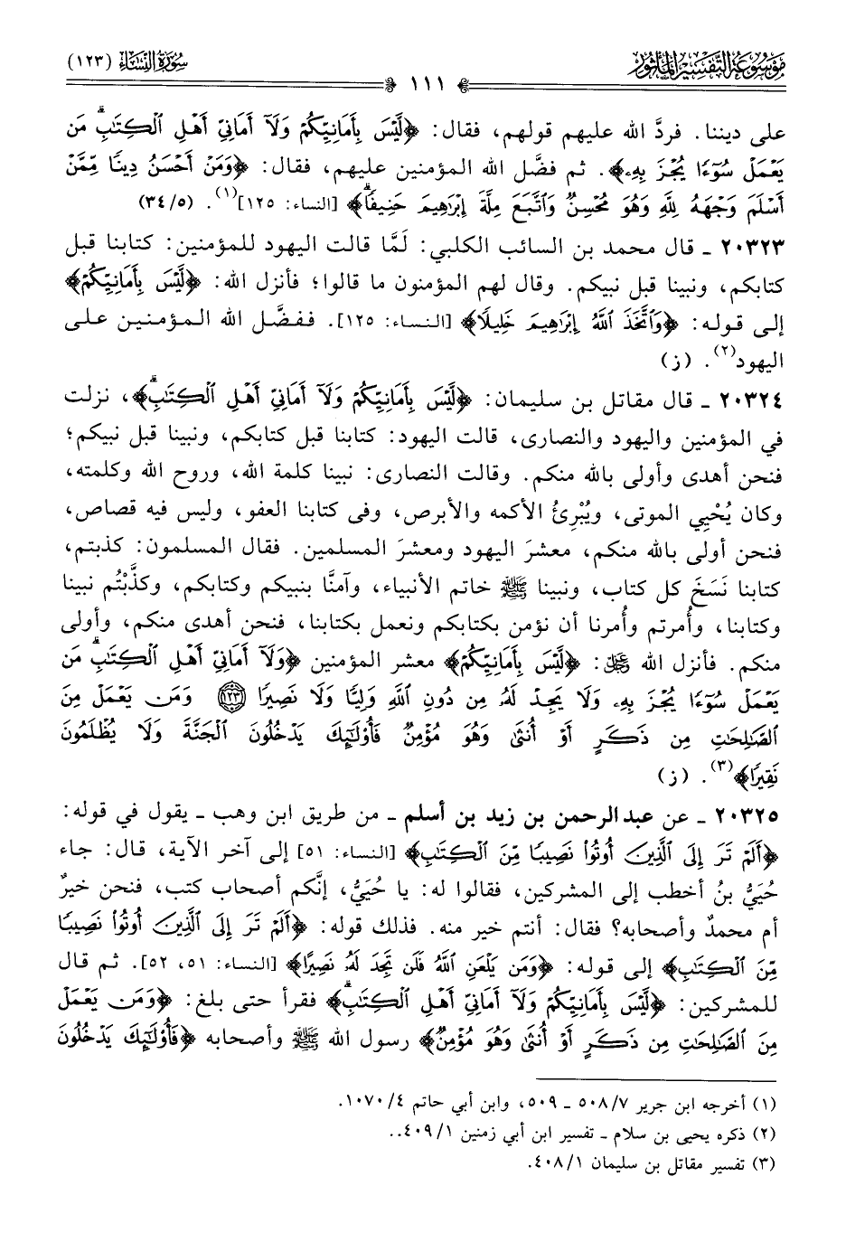 ٢٠٣٢٤ - قال مقاتل بن سليمان: {ليس بأمانيكم ولا أماني أهل الكتاب}، نزلت في المؤمنين واليهود والنصارى، قالت اليهود: كتابنا قبل كتابكم، ونبينا قبل نبيكم؛ فنحن أهدى وأولى بالله منكم. وقالت النصارى: نبينا كلمة الله، وروح الله وكلمته، وكان يُحْيِي الموتى، ويُبْرِئُ الأكمه والأبرص، وفى كتابنا العفو، وليس فيه قصاص، فنحن أولى بالله منكم، معشرَ اليهود ومعشرَ المسلمين. فقال المسلمون: كذبتم، كتابنا نَسَخَ كل كتاب، ونبينا - صلى الله عليه وسلم - خاتم الأنبياء، وآمنّا بنبيكم وكتابكم، وكذَّبْتُم نبينا وكتابنا، وأُمرتم وأُمرنا أن نؤمن بكتابكم ونعمل بكتابنا، فنحن أهدى منكم، وأولى منكم. فأنزل الله - عز وجل -: {ليس بأمانيكم} معشر المؤمنين {ولا أماني أهل الكتاب من يعمل سوءا يجز به ولا يجد له من دون الله وليا ولا نصيرا (١٢٣) ومن يعمل من الصالحات من ذكر أو أنثى وهو مؤمن فأولئك يدخلون الجنة ولا يظلمون نقيرا} (¬٣). (ز)